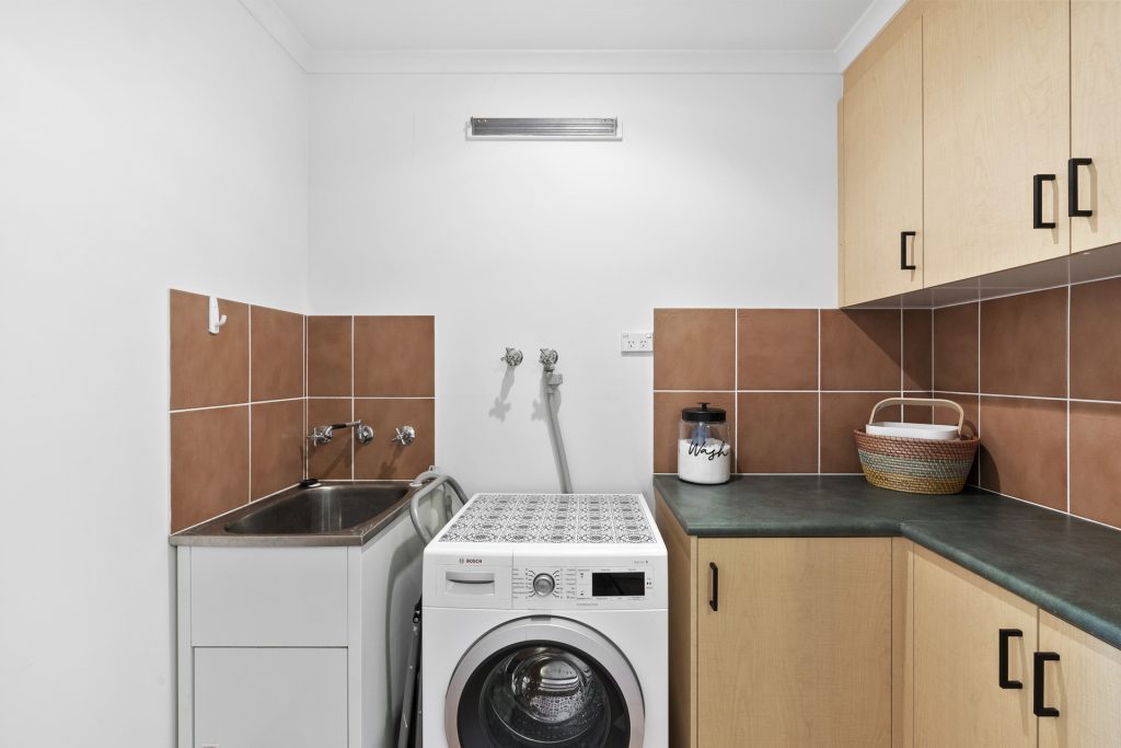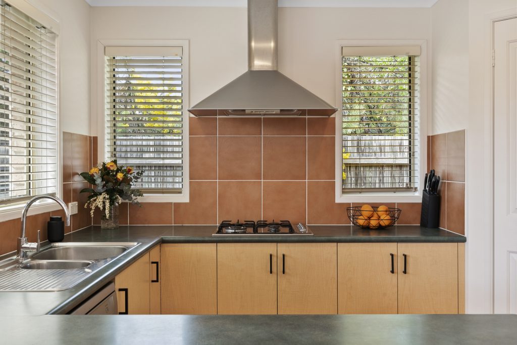 – Good-sized kitchen with garden outlook, loads of storage and bench space, including breakfast bar, cavernous pantry, and gas hob