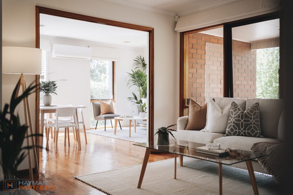 – Open-plan living and dining with timber floors and floor-to-ceiling windows