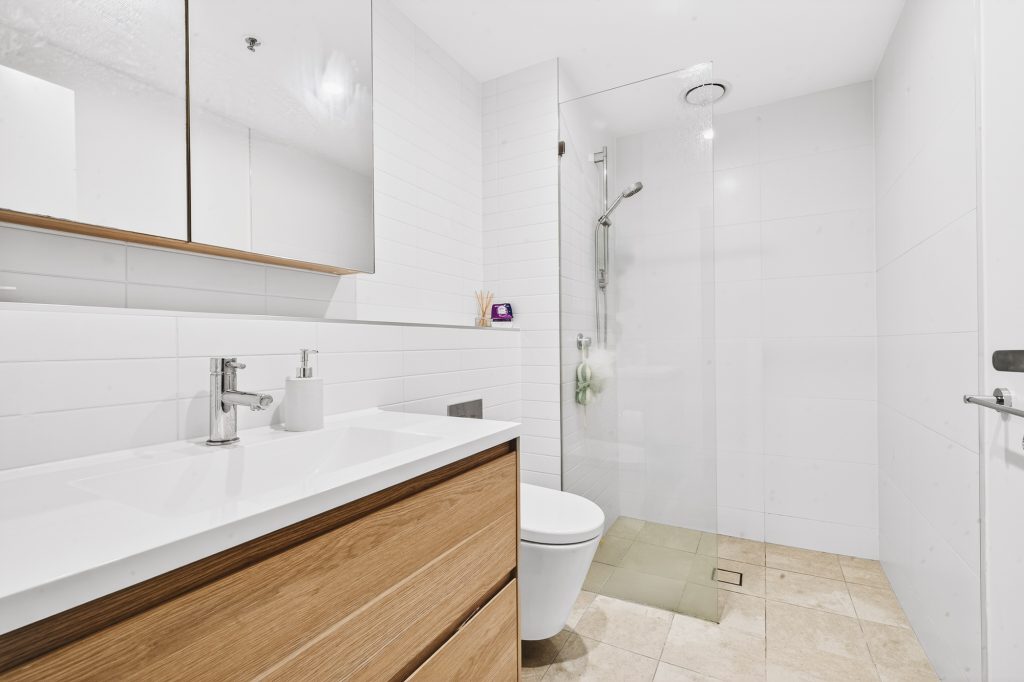The bathrooms showcase a refined, contemporary finish, with white tiled walls complemented by neutral slate floors for a balanced, elegant look.