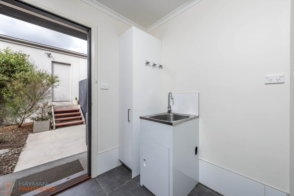A downstairs bedroom with ensuite, opening onto the rear courtyard of native plants, could easily also serve as an office, music or TV room. A laundry with storage and a separate toilet round out the very functional ground floor.