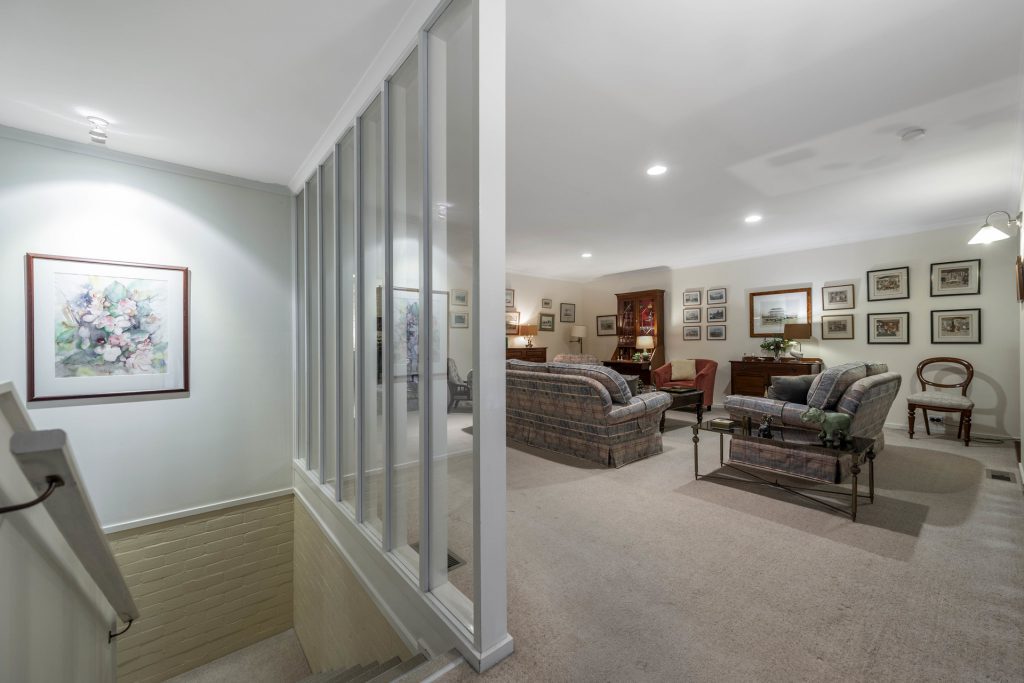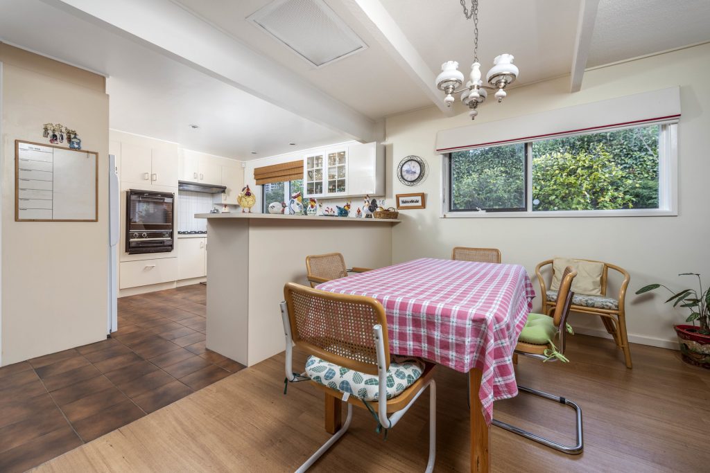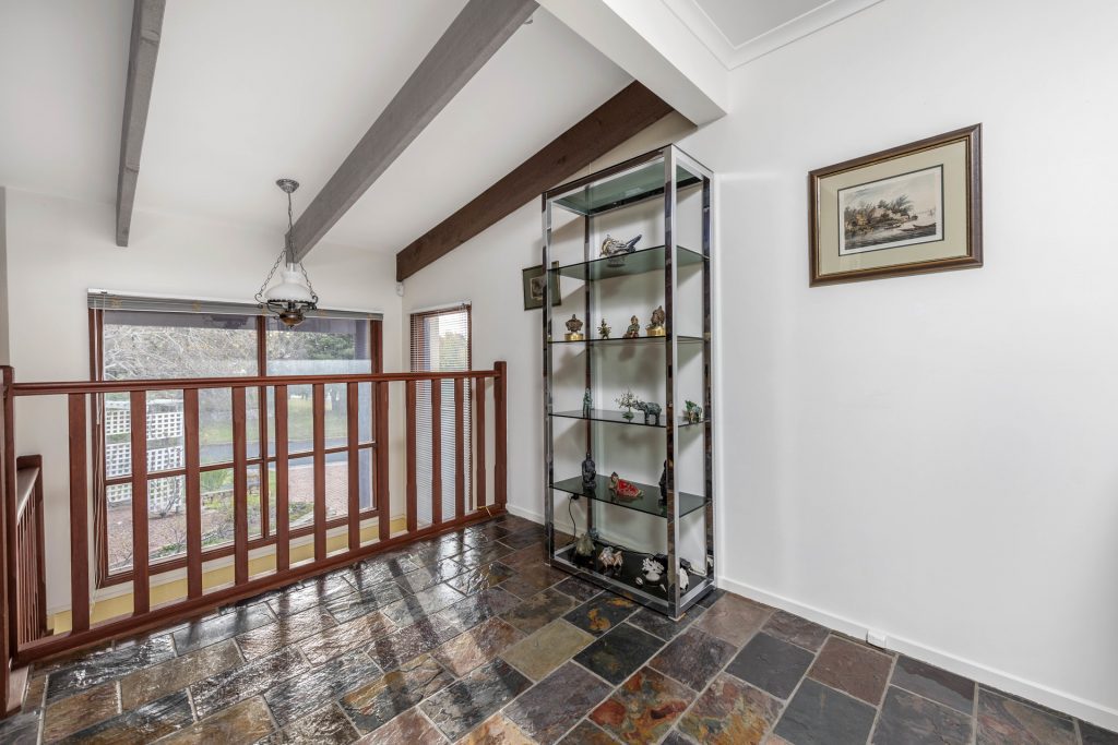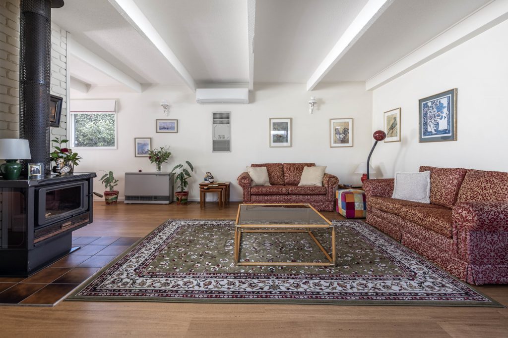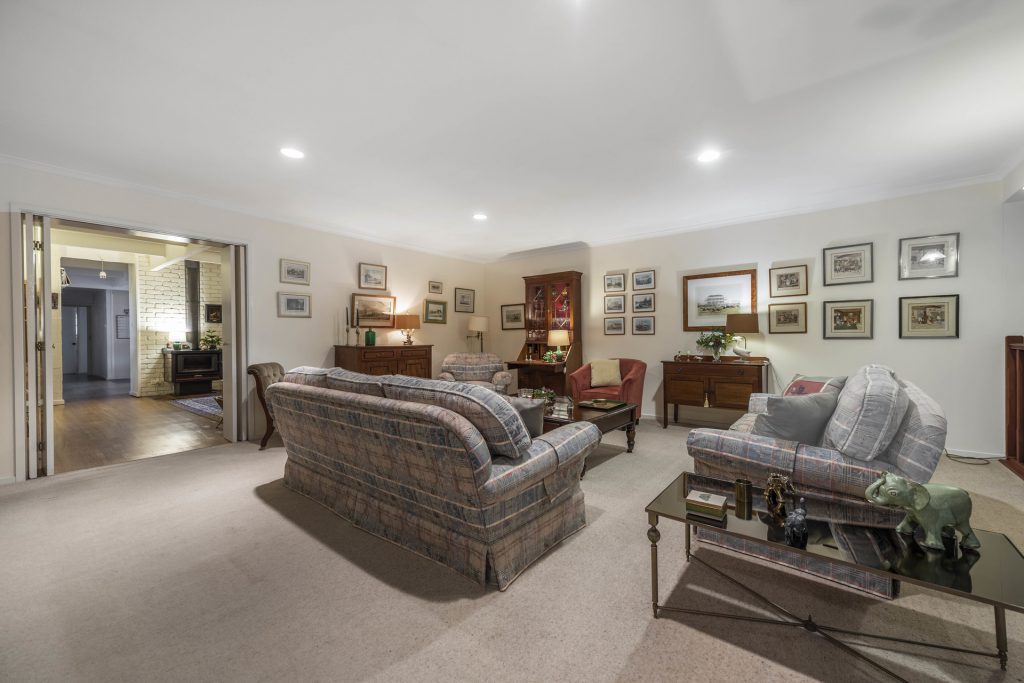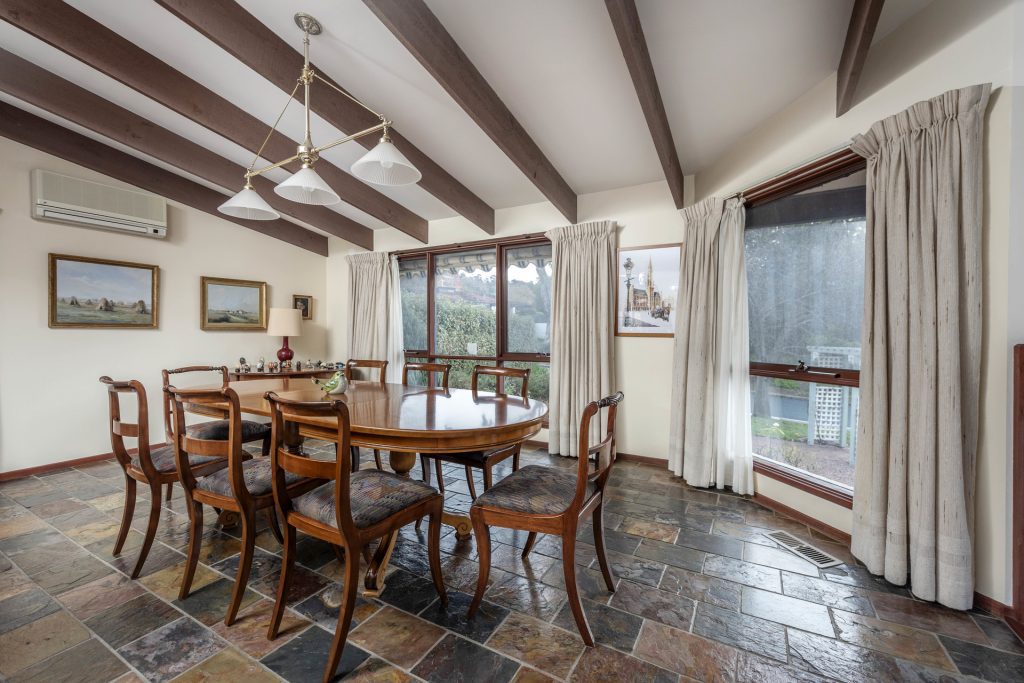 – Formal split-level living and dining room with raked timber ceilings