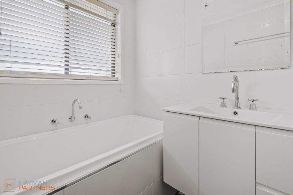 – Updated bathroom with floor-to-ceiling tiles and custom vanity