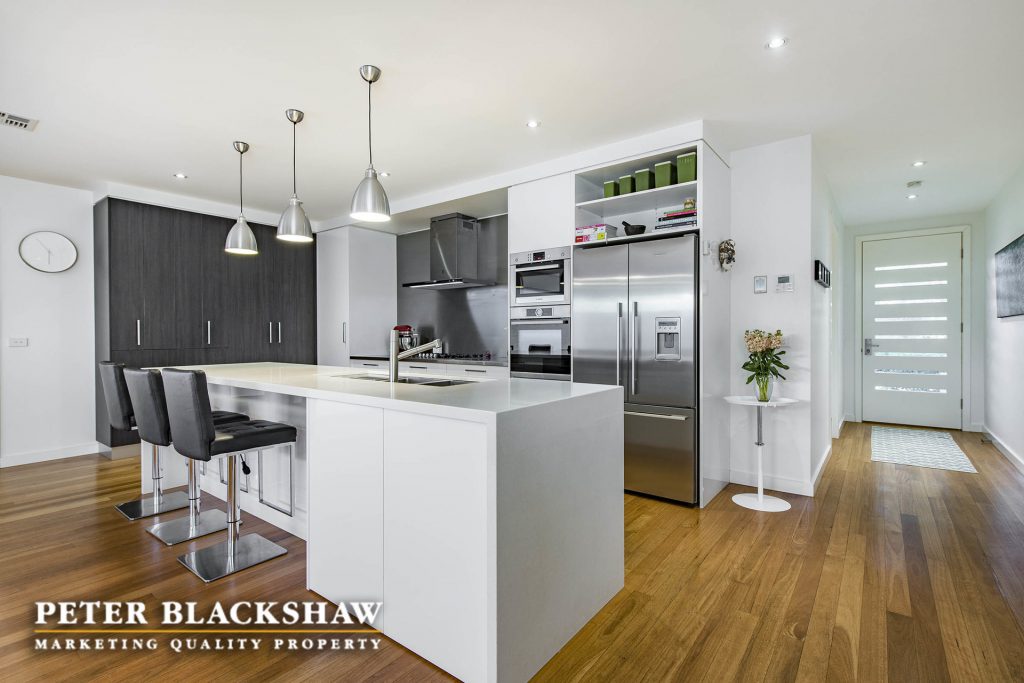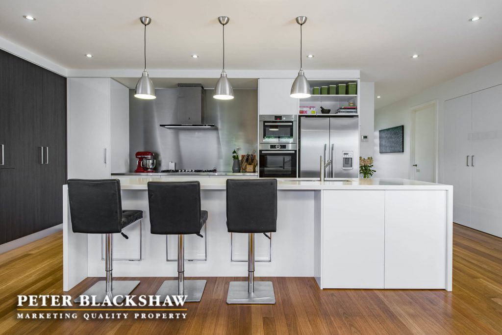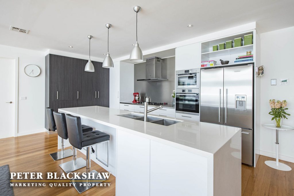 High end kitchen with waterfall stone bench top, soft close cupboards and stainless appliances