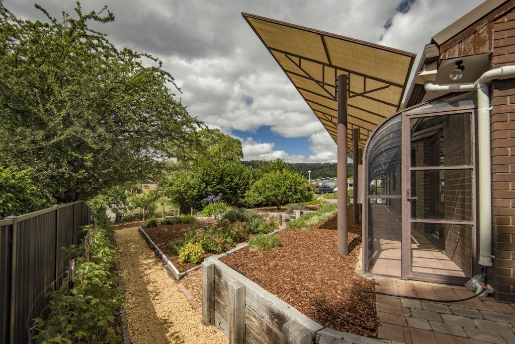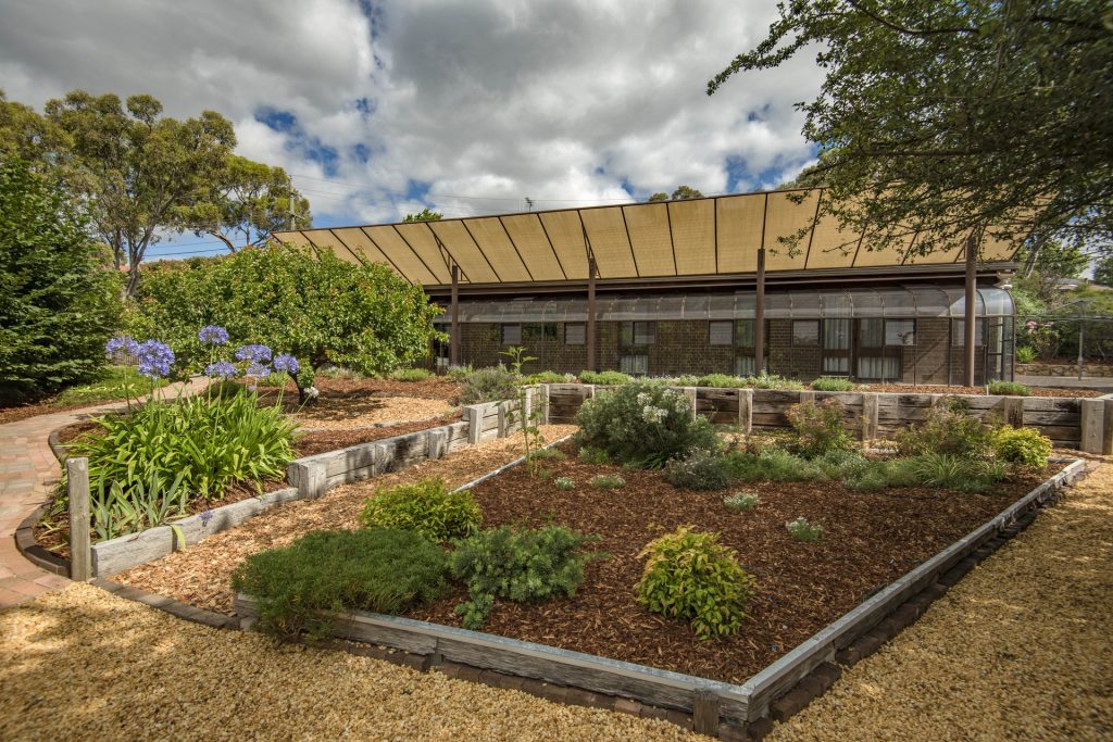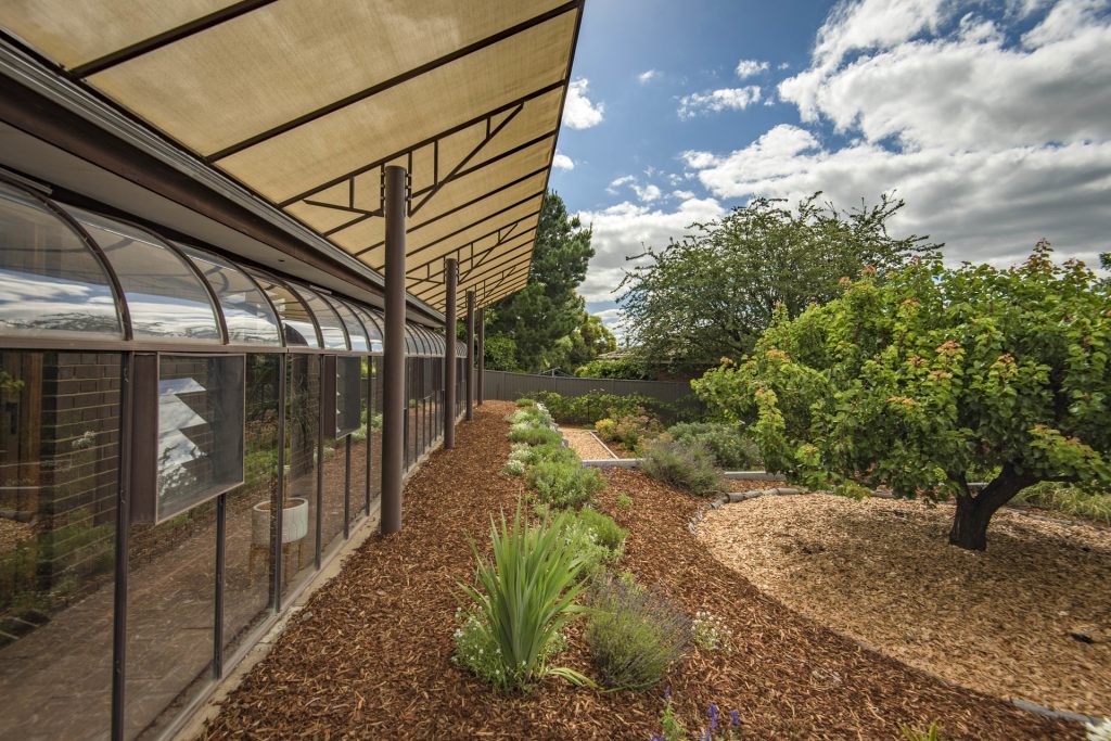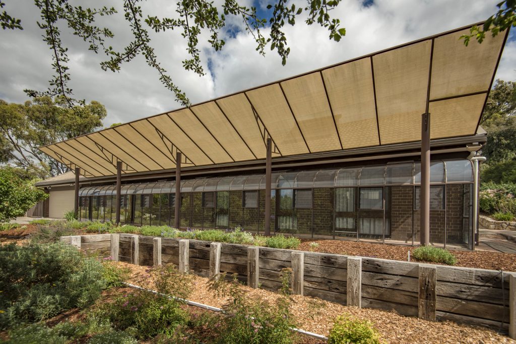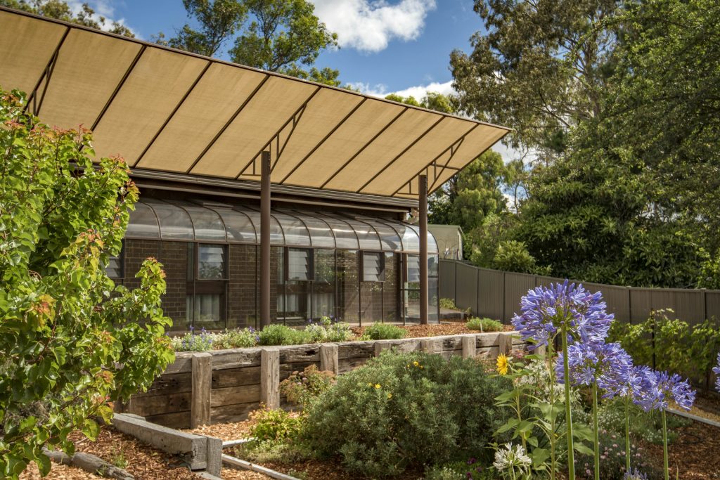 – Passive solar design facing north with glasshouse and shade sail to regulate sun access in summer and winter