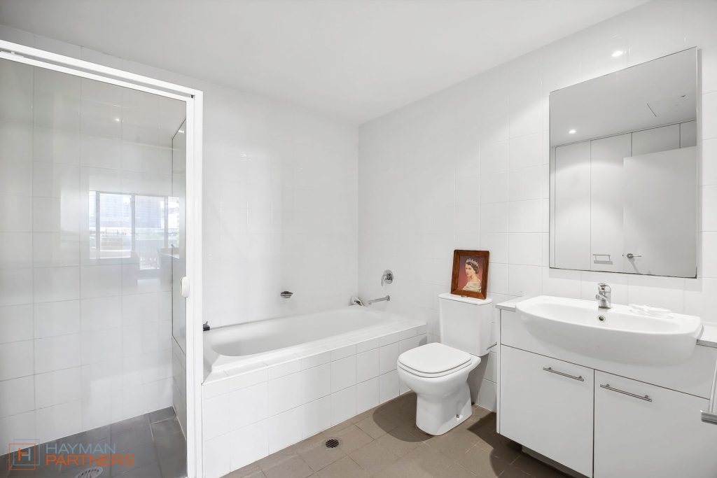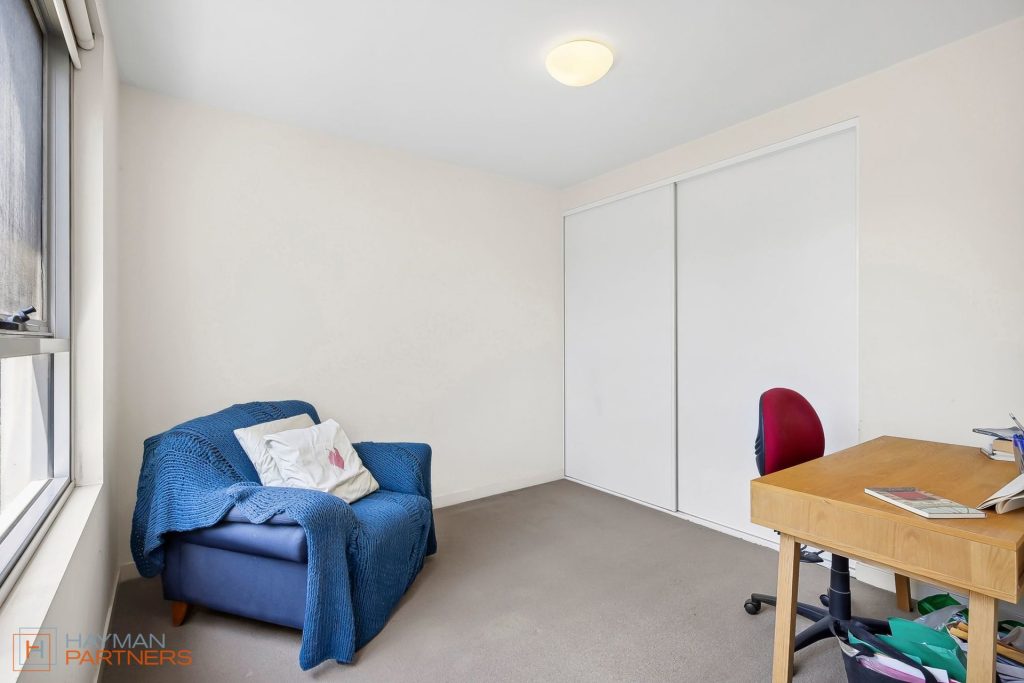 The apartment showcases a carpeted bedroom and sperate oversized study room with both rooms having built in robes. Servicing the apartment is a large bathroom with a standalone shower, bathtub, vanity, and toilet.