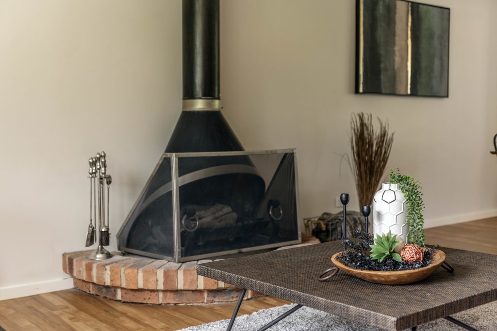 – Open plan living and dining area with wood burning fireplace