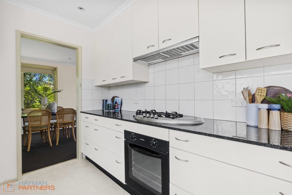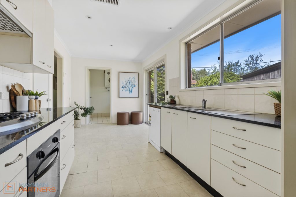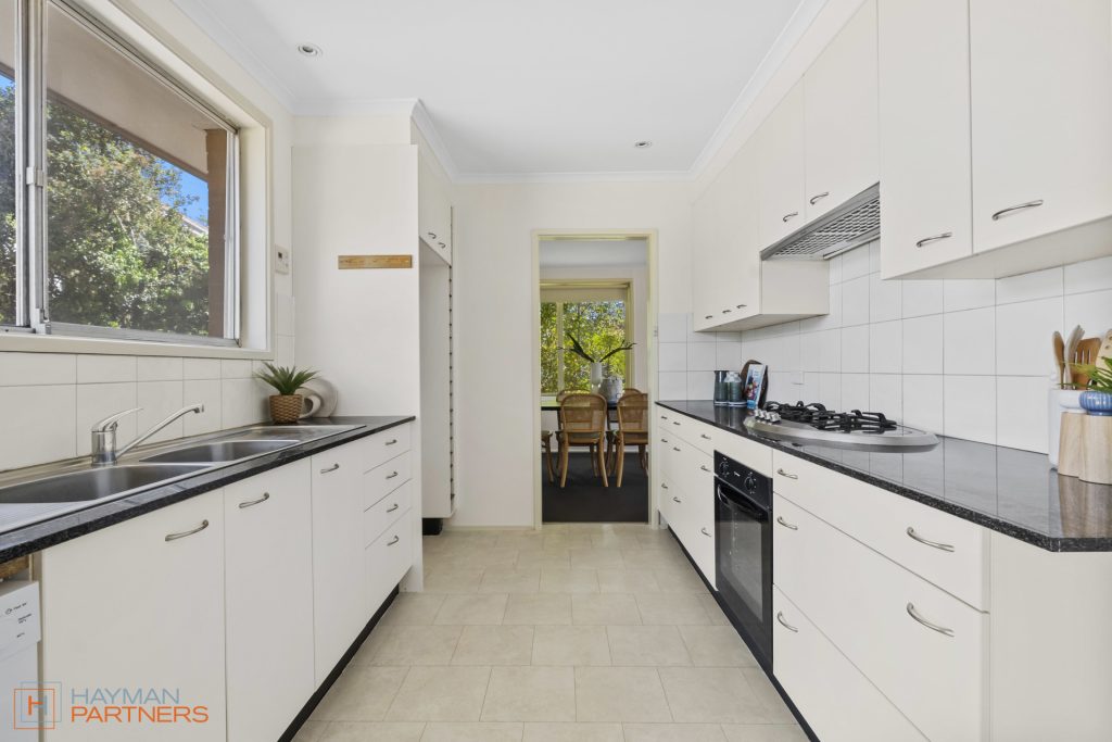 – Modern galley kitchen with stone benchtops, gas cooktop & excellent storage