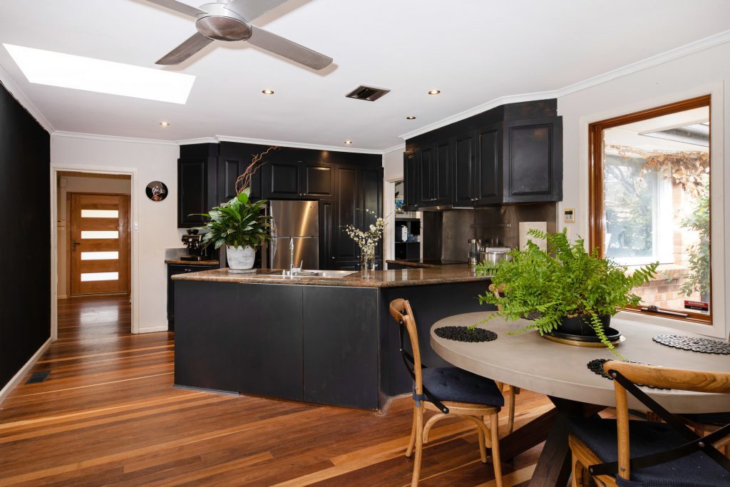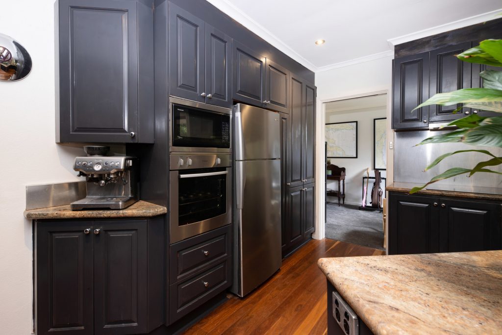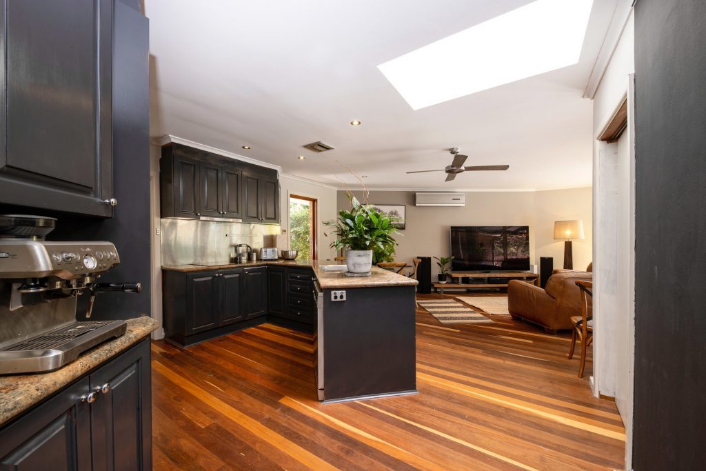 – Brush Box timber kitchen with stainless steel appliances, integrated dishwasher,
