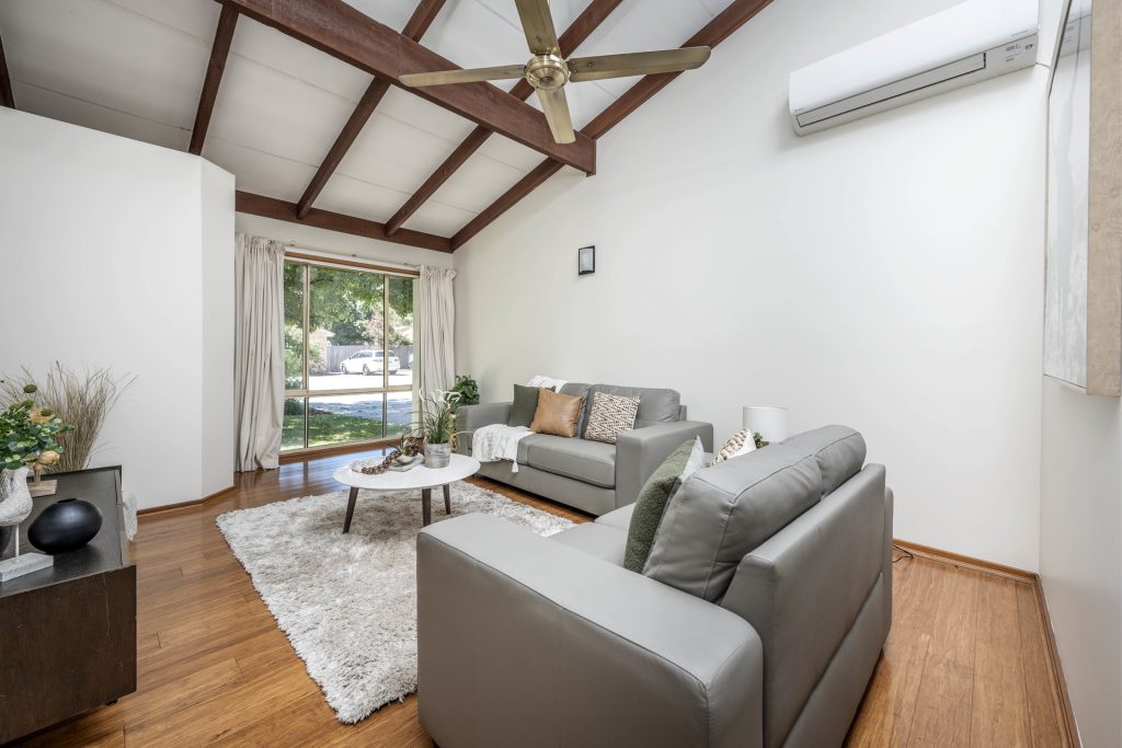 • Living room with bamboo flooring and feature raked ceilings