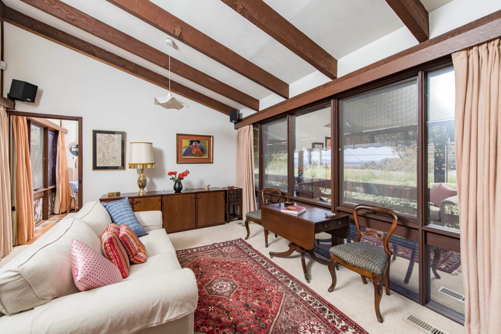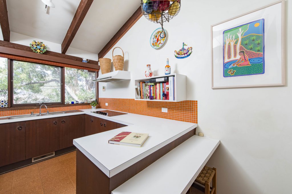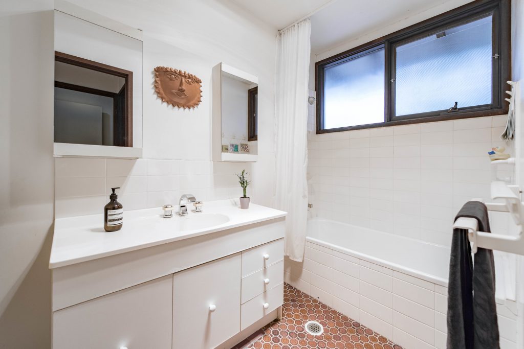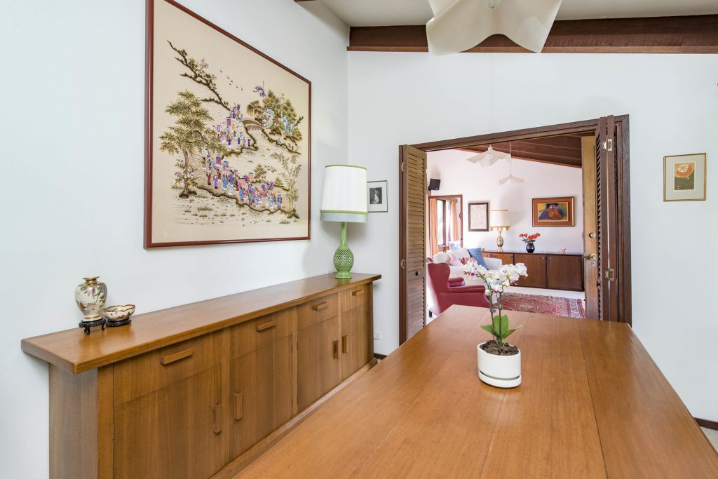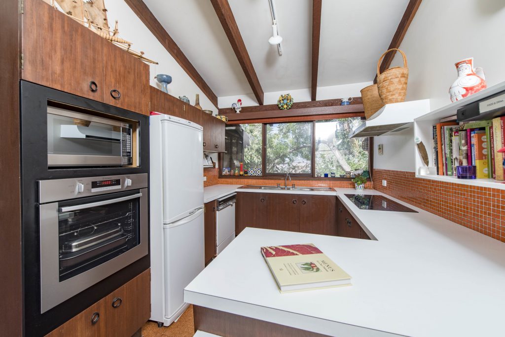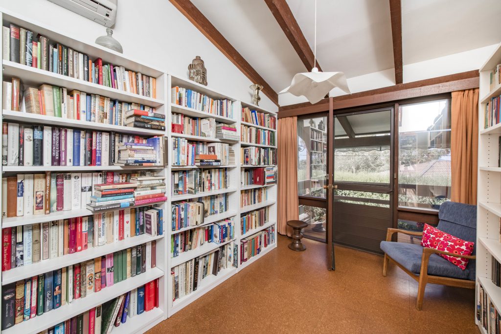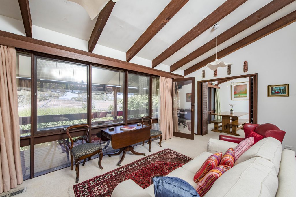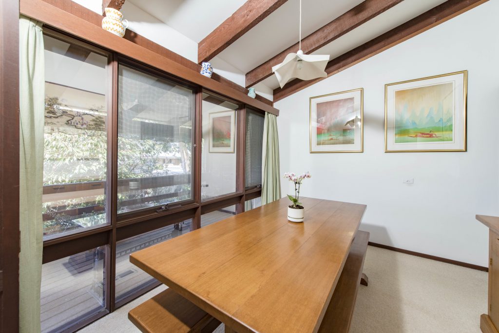 In the style of late 20th century Sydney modern design the peaceful entry, bedrooms and living spaces are planned around a sunny courtyard. The home features exposed timber beams and high raked ceilings in living, dining and study areas with extensive windows.