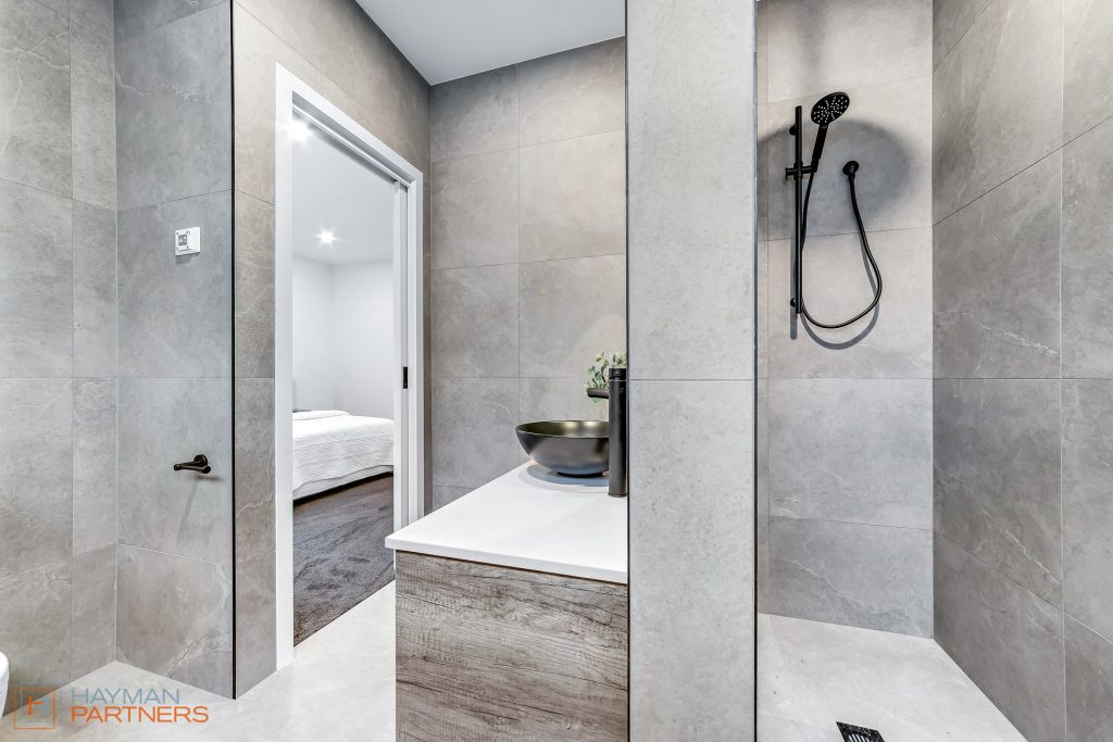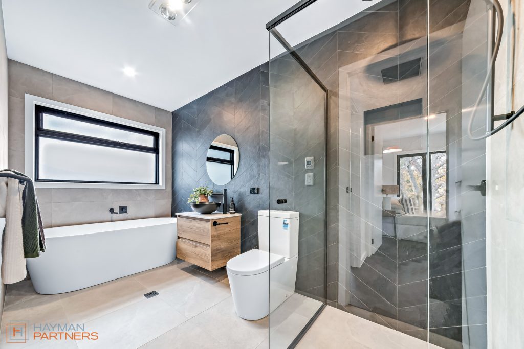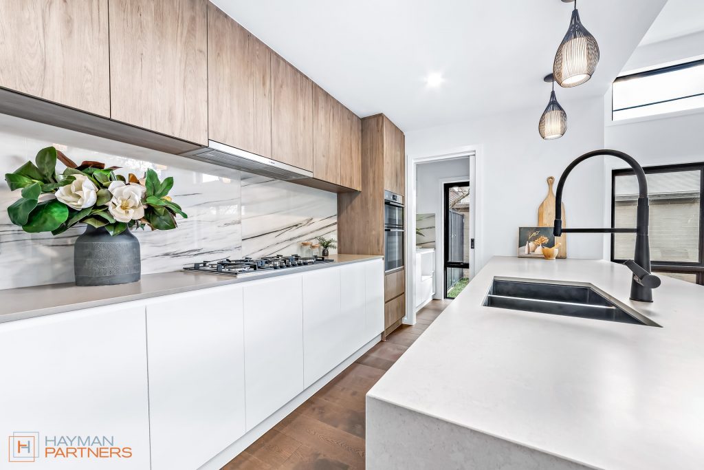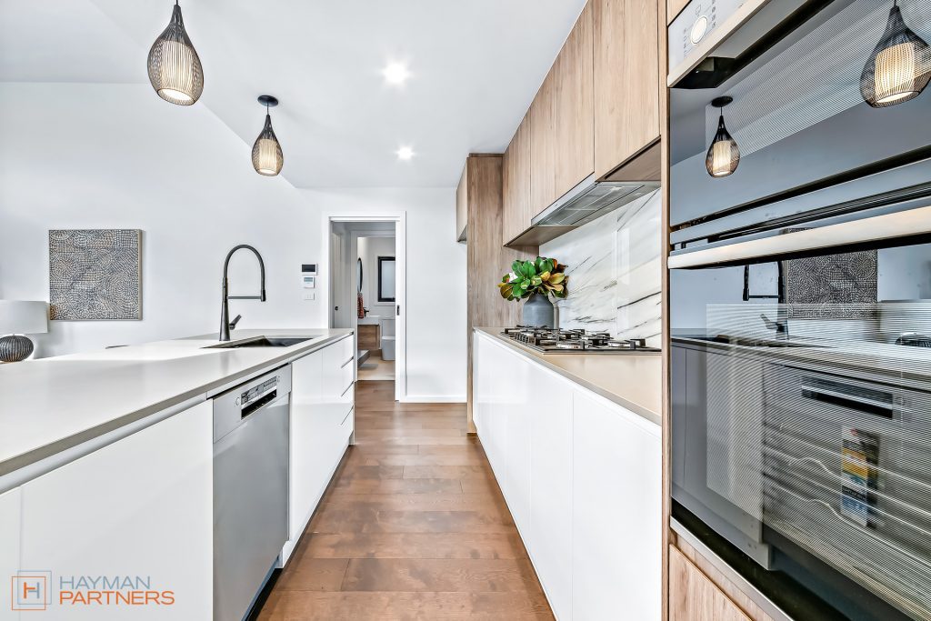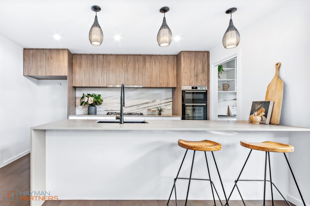 Kitchen with stone waterfall bench, soft-closing cabinetry and integrated dishwasher