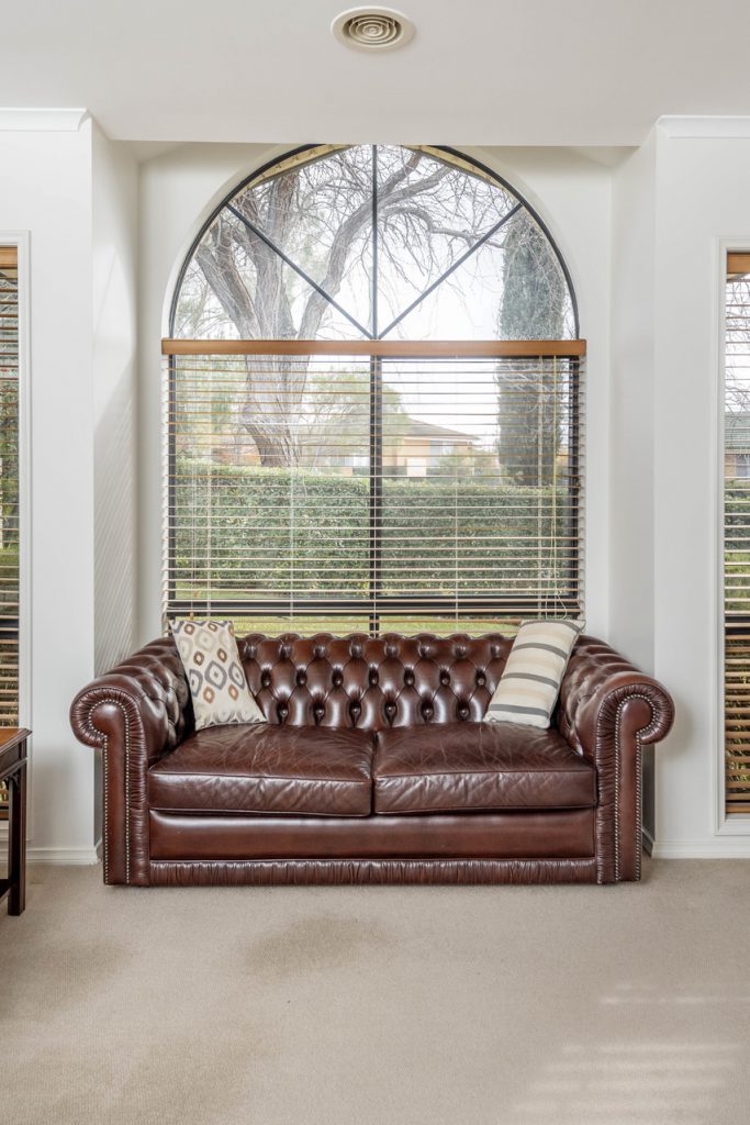 * North facing formal lounge room with raked ceilings, feature window and built-in surround-sound speaker system