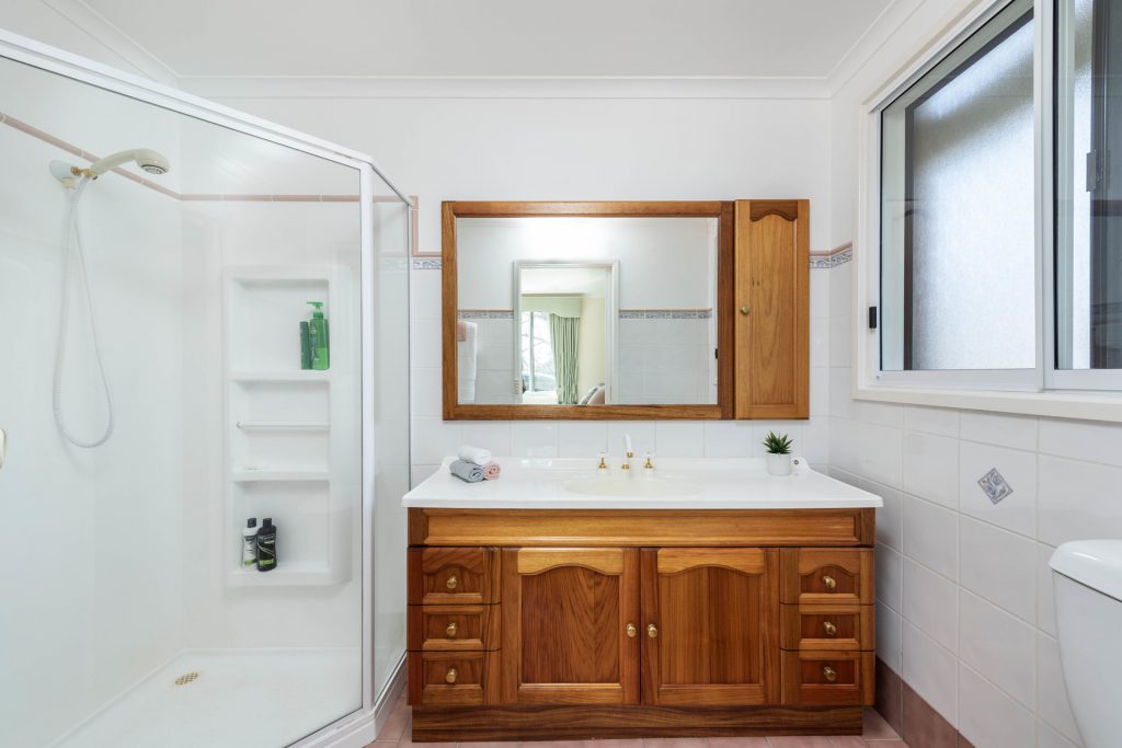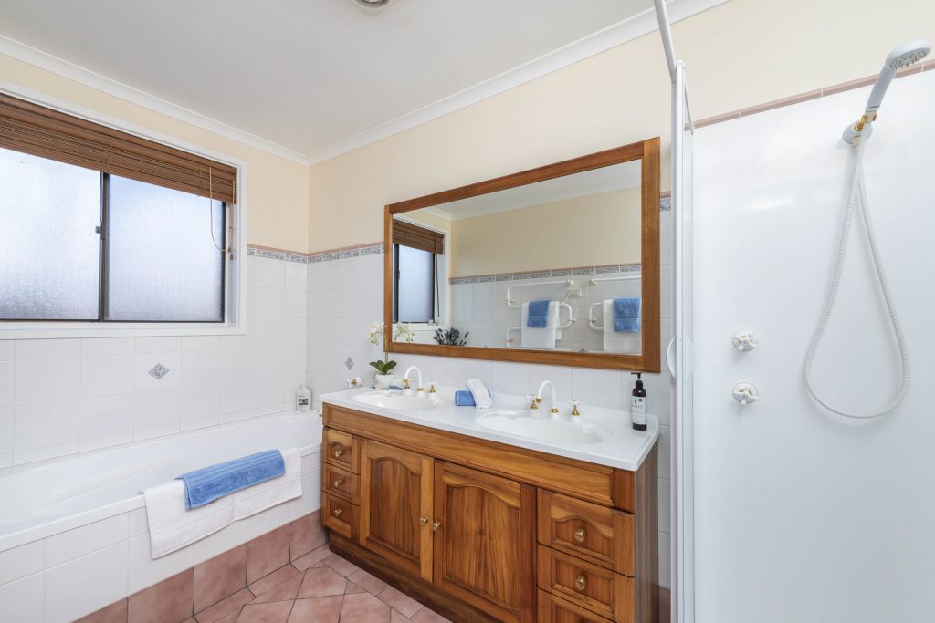 * Main bathroom with full-sized tub, double vanity unit, solid timber cabinetry & heated towel rails plus separate shower recess & WC