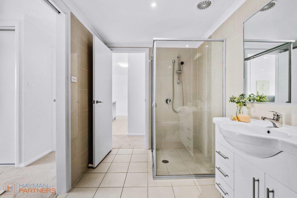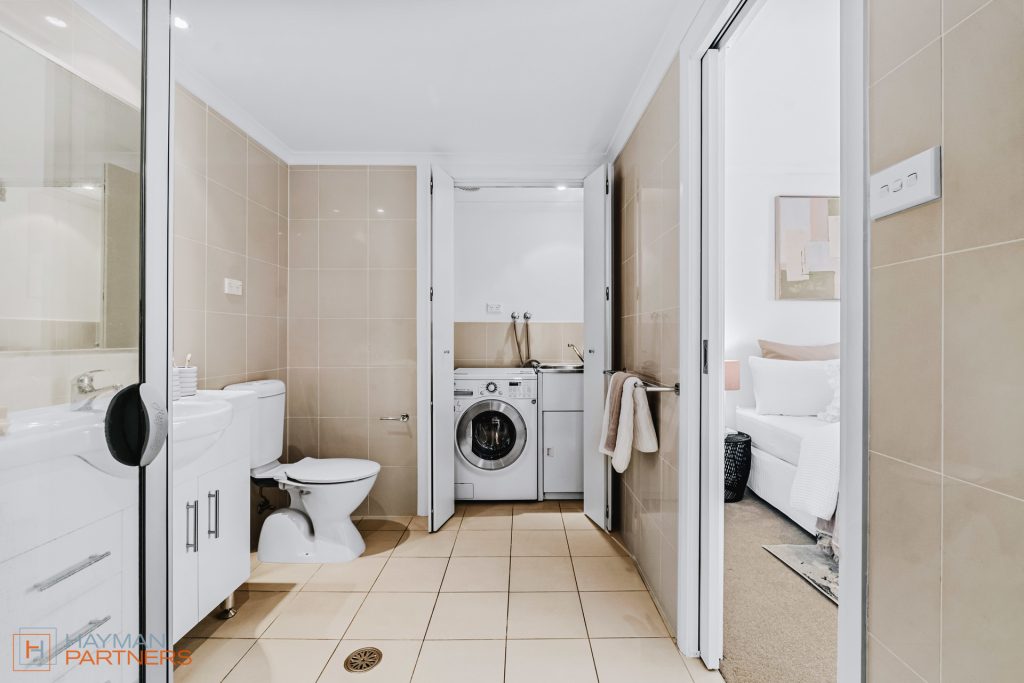 – Modern two-way bathroom with European laundry