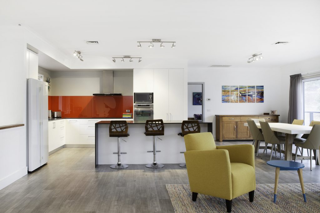 The main living areas are located on the upper floor of the home and include a large family and meals area with feature gas fireplace as well as a semi open plan sitting room. The living areas connect seamlessly to the kitchen and open out to the elevated deck wrapping around the side of the home and taking in the stunning views. The designer kitchen offers waterfall stone bench tops, a large island bench and breakfast bar, quality stainless steel appliances and plenty of storage.