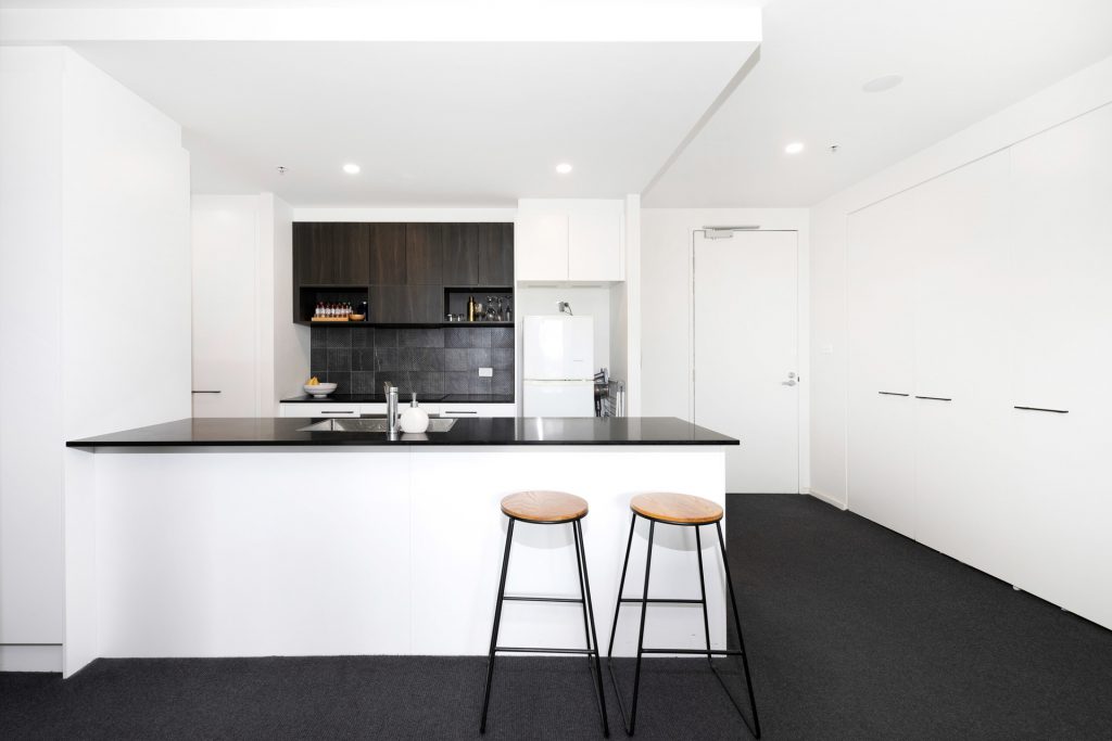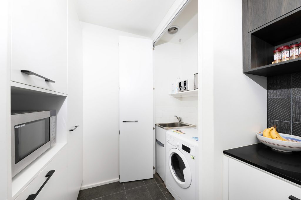 The apartment creates a sense of luxury and space with high ceilings and square set finishes throughout, accentuated by the full height double-glazed sliding doors & windows. The fully equipped and versatile kitchen offers stone benchtops, stainless-steel Smeg appliances including dishwasher, a full-length pantry with overhead cupboards to the ceiling for additional storage.