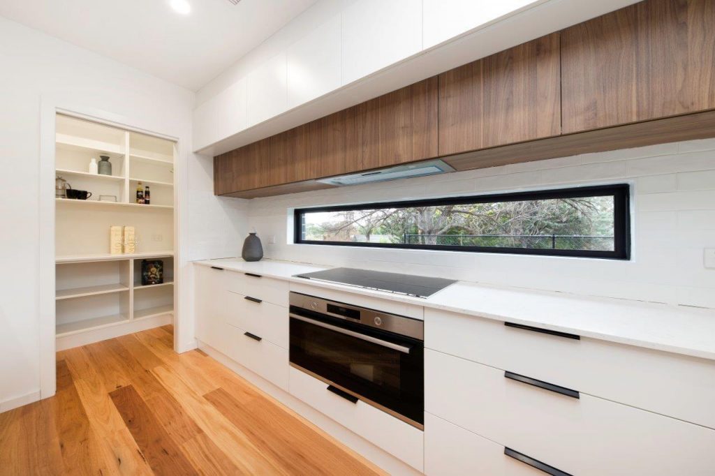 Designer kitchen with attractive stone bench-tops, Bosch appliances, an abundance of storage and fantastic walk-in pantry