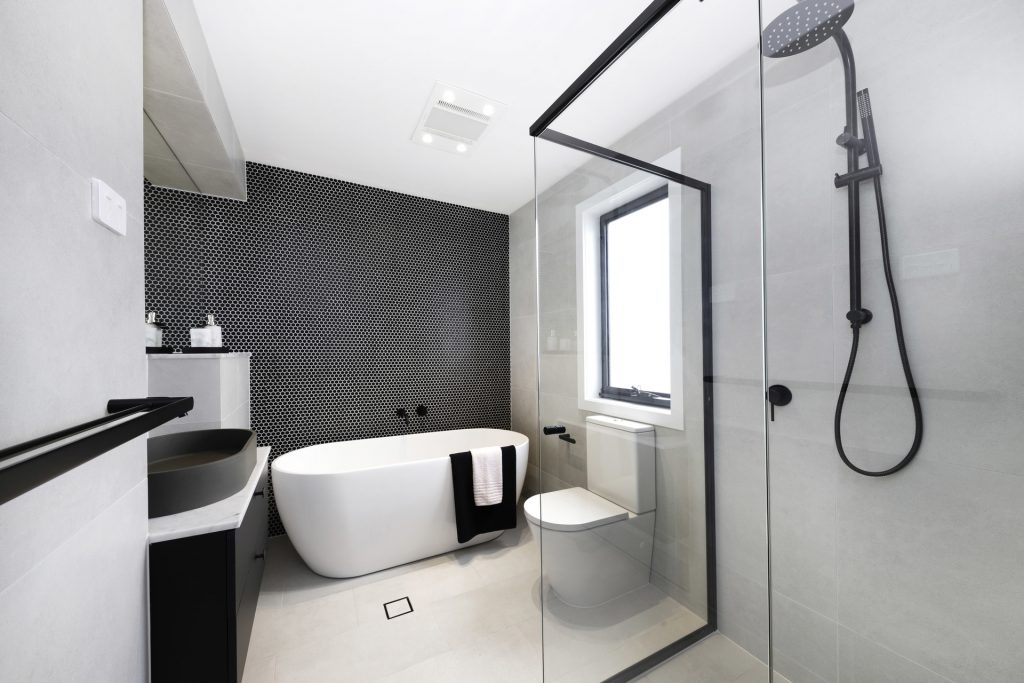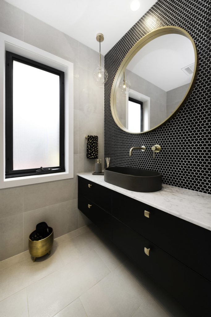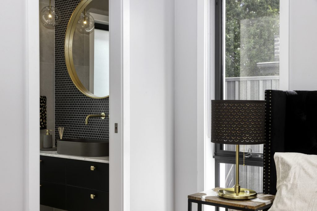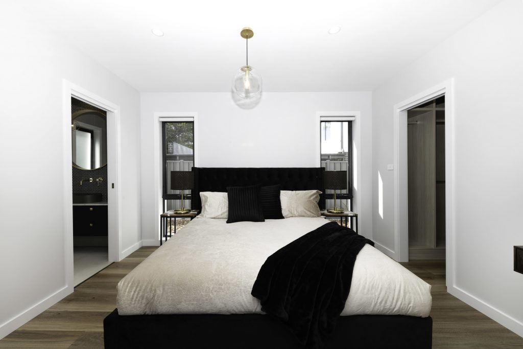 Master bedroom with large walk-in wardrobe and designer ensuite, marble benchtops