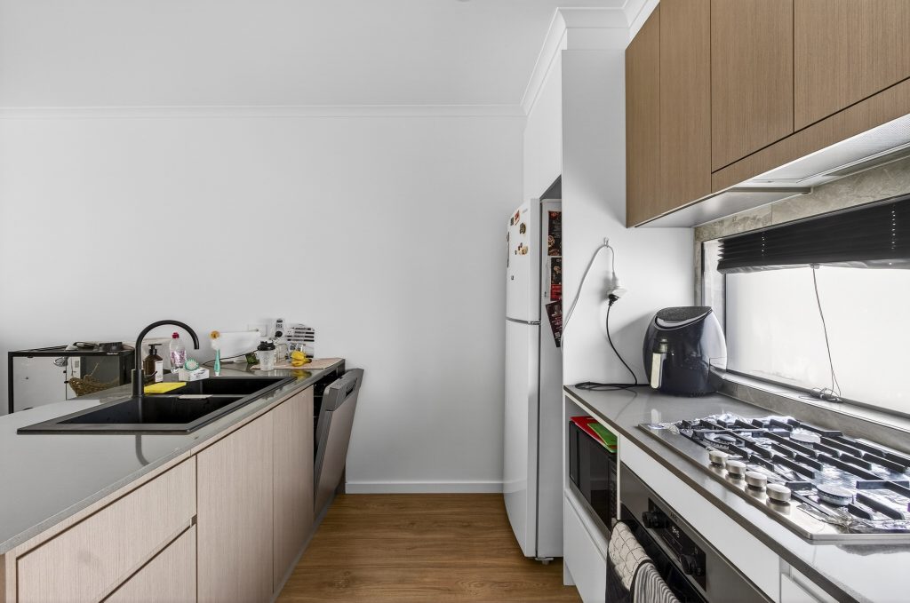– Modern kitchen with stone benchtops, gas cooktop, ample storage, and timber flooring