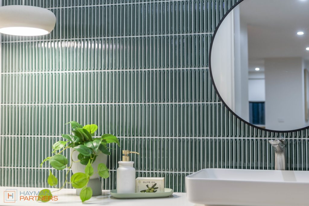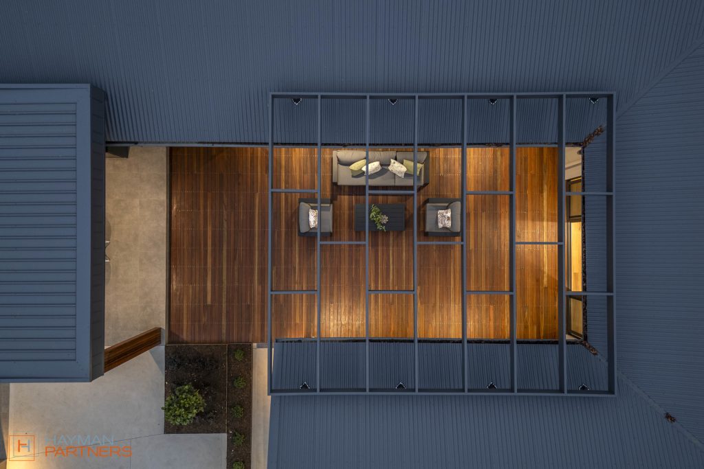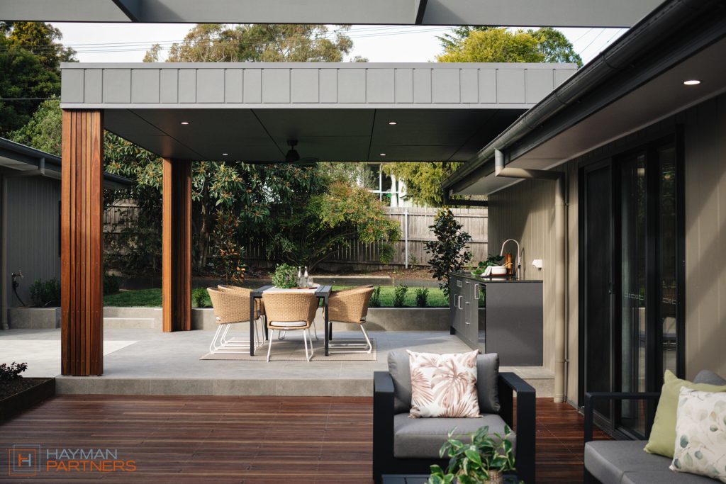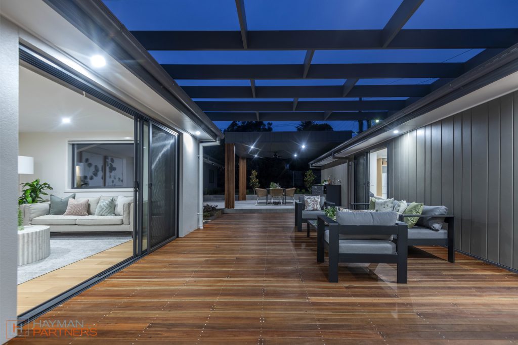 – Spotted gum decking and porcelain tiles