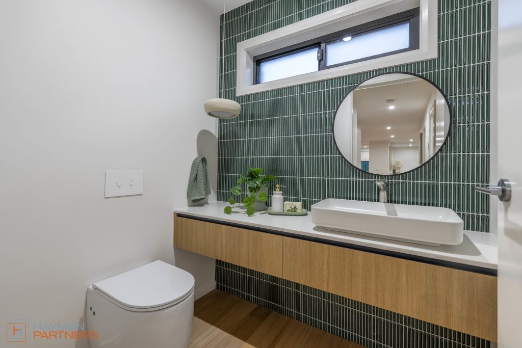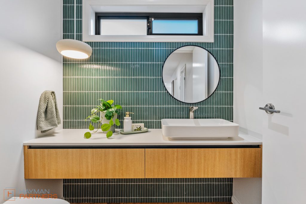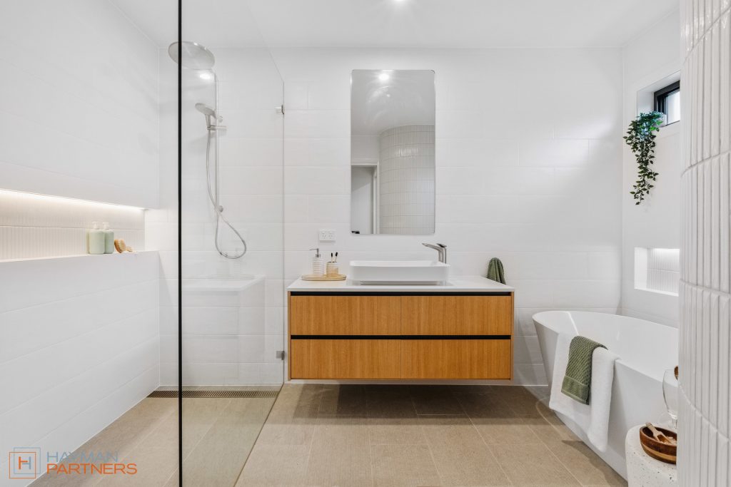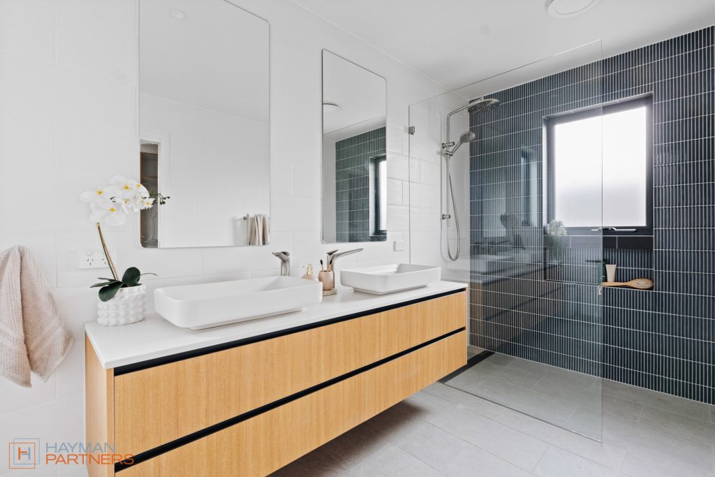 Designer bathrooms with premium Phoenix fixtures and custom made vanities with 20mm Fresco Stone