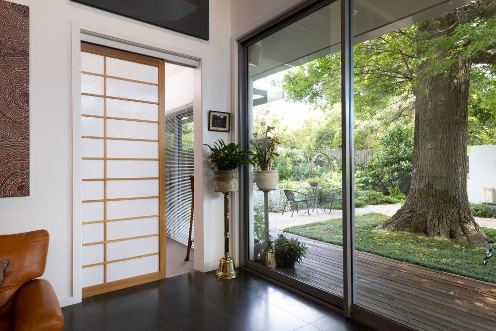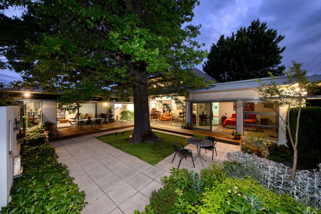 The back garden is essentially an outdoor room with a roof formed by a large deciduous tree.