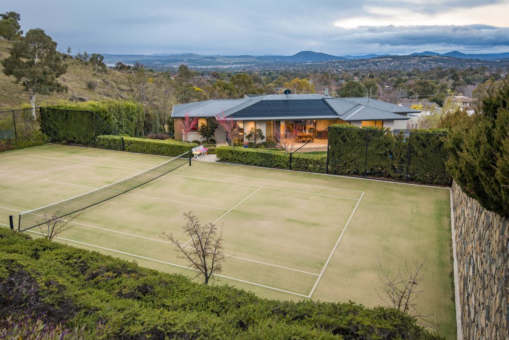 Features include vast glass lined living spaces flowing to a beautiful landscaped garden and terraces which features a full size tennis court and in ground pool. Perfect north aspect, state-of-the-art finishes. Ample accommodation with four bedrooms huge main bedroom suite with walk-in-robes and ensuite with bath. Separate study or fifth bedroom. Downstairs rumpus room ideal for teenagers. Formal and informal living and dining areas extend out through glass doors onto a covered entertaining area. Wonderful outlook in all directions. Large double garage with internal access.