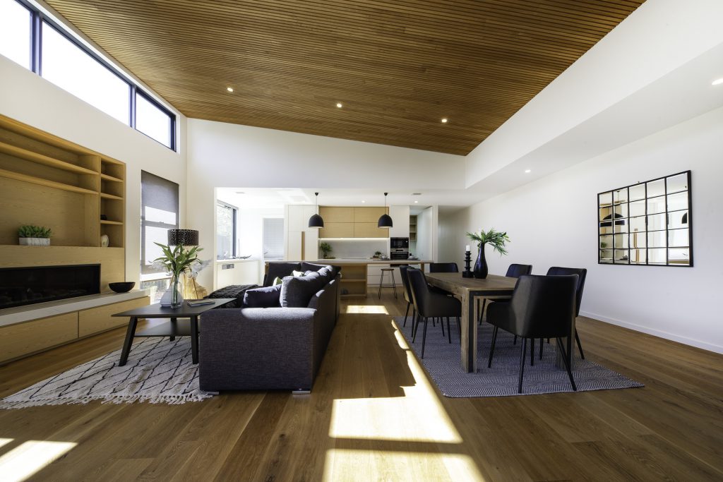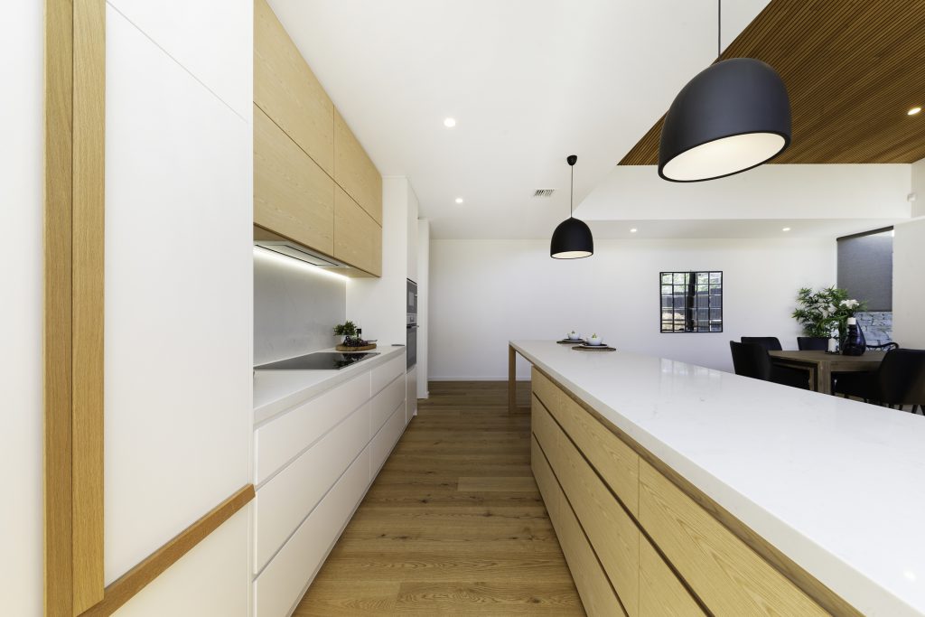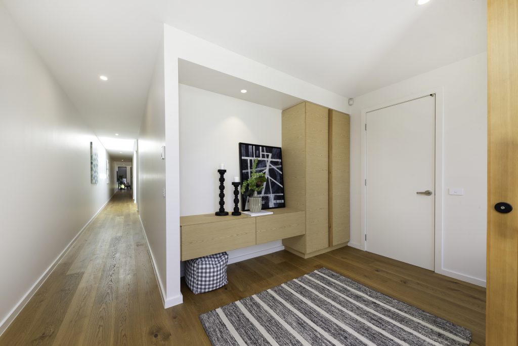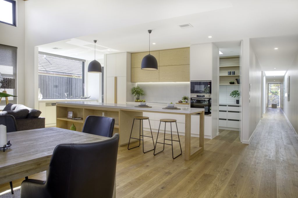 A modest streetscape understates a stylish and chic design with subtle use of skylights and timber to provide warm overtones and all the luxury inclusions from hallway atrium to a walk-in butler’s pantry. Thoughtful placement of the master suite at the opposite end to the living area means the floorplan will complement the way most people live. Highlights include the use of timber batons on the ceiling in the entertainer’s kitchen/family room flowing out to the outdoor alfresco BBQ entertaining space and the atrium breaking up the hallway.