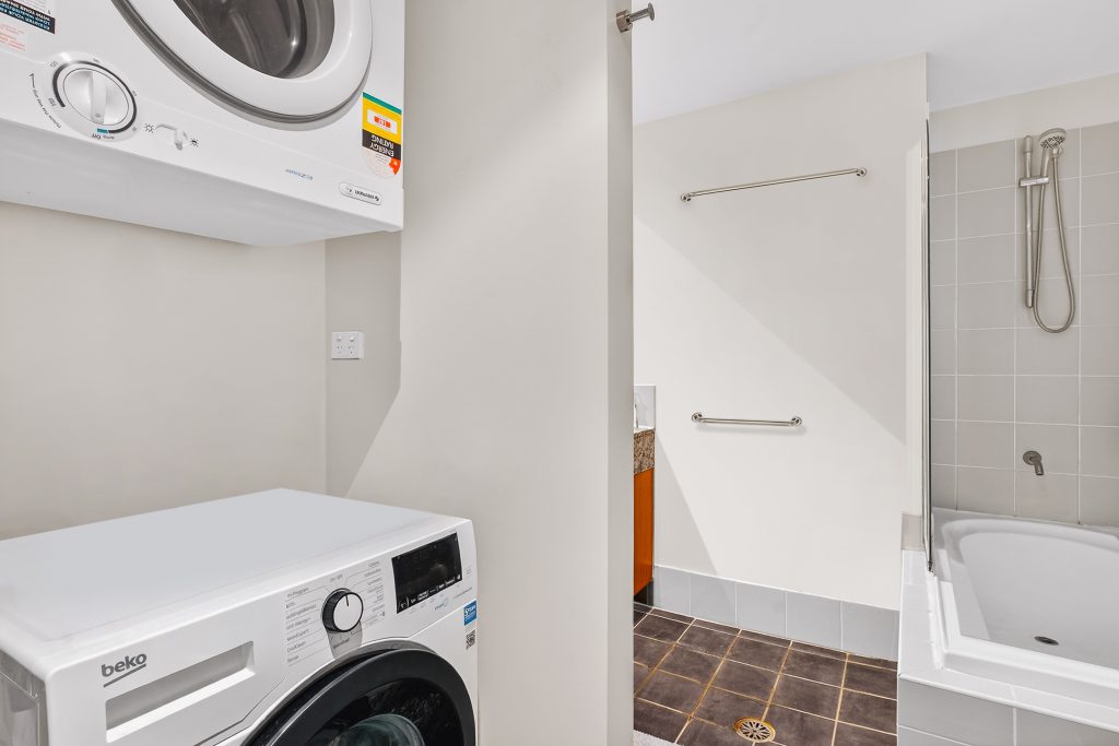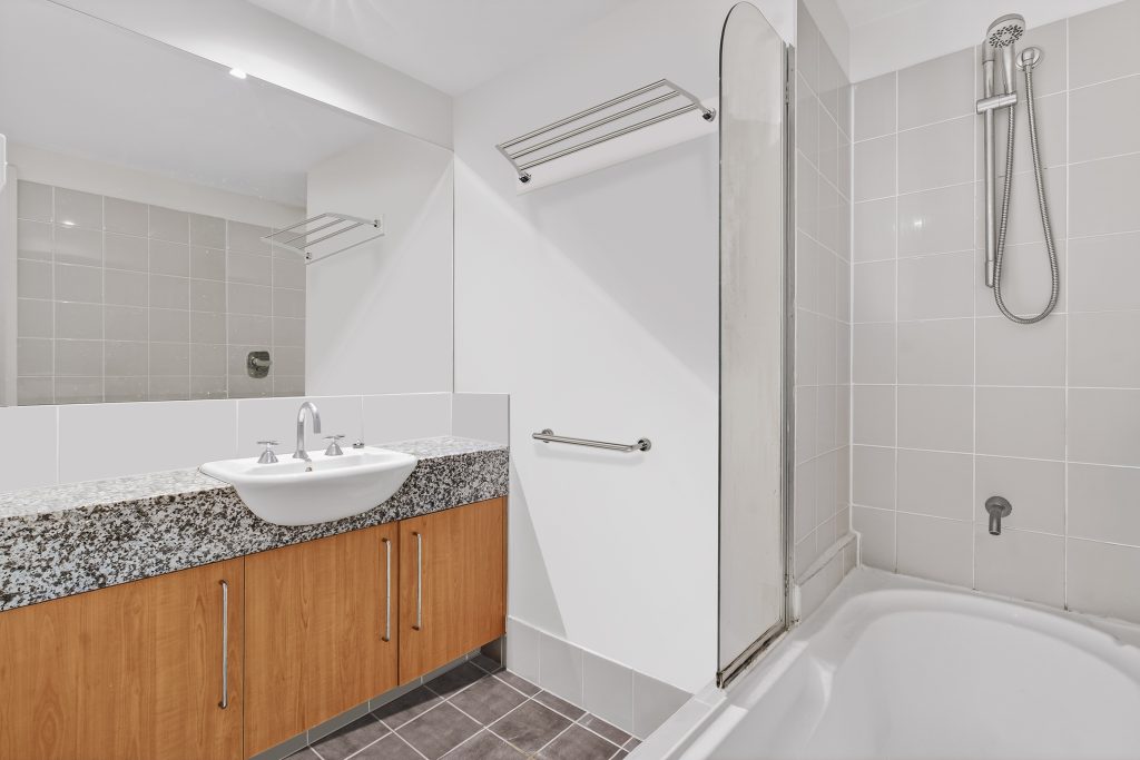 The oversized bedroom includes a built-in robe, serviced by a well-appointed bathroom with a full-sized bath and shower combination, and generous vanity. A secure car space completes the offering.
