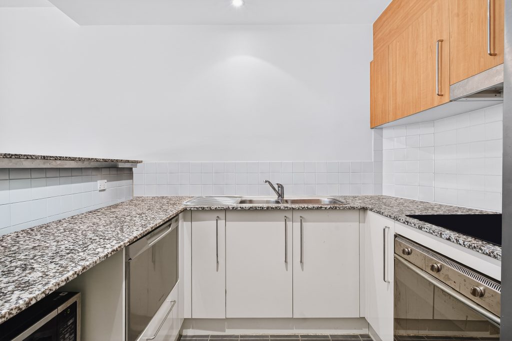 – Kitchen with stone benchtops, stainless steel appliances and dishwasher