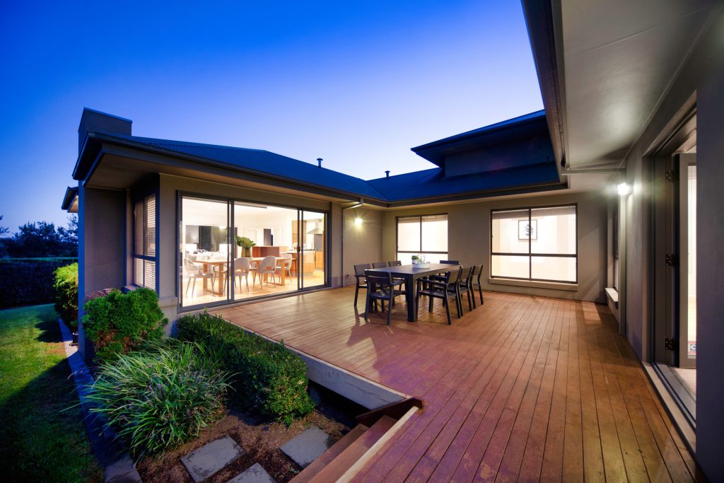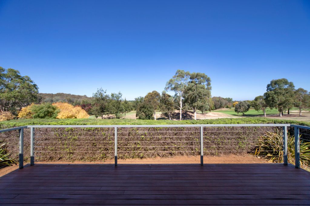Fully landscaped gardens surround three outdoor entertaining areas including an elevated deck overlooking the golf course and a private sun-drenched courtyard deck area with a water feature and large wooden privacy screens.