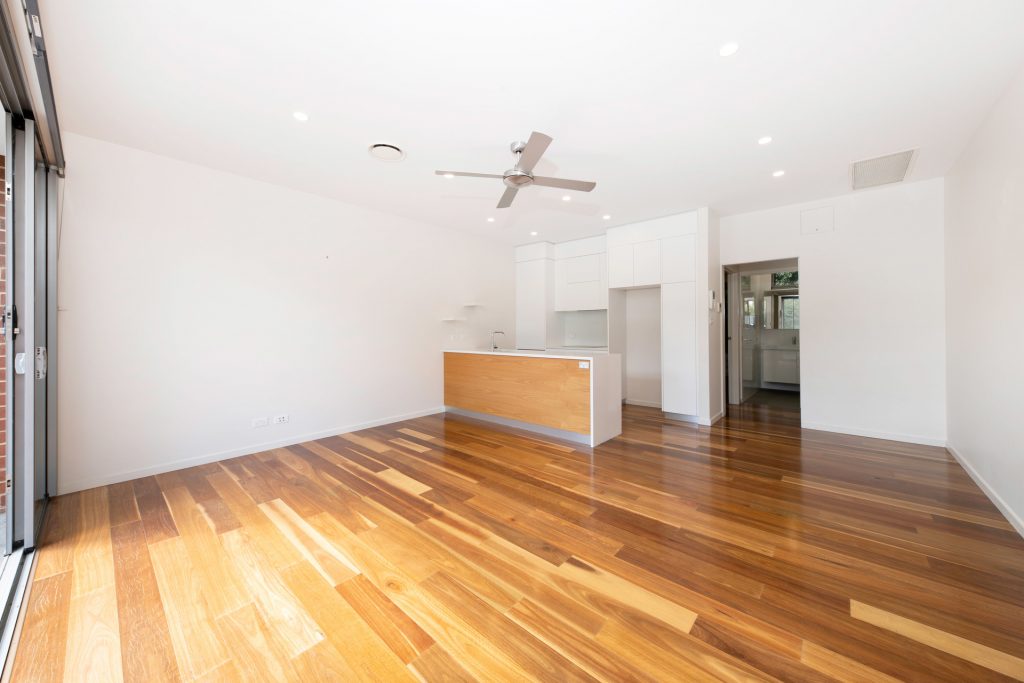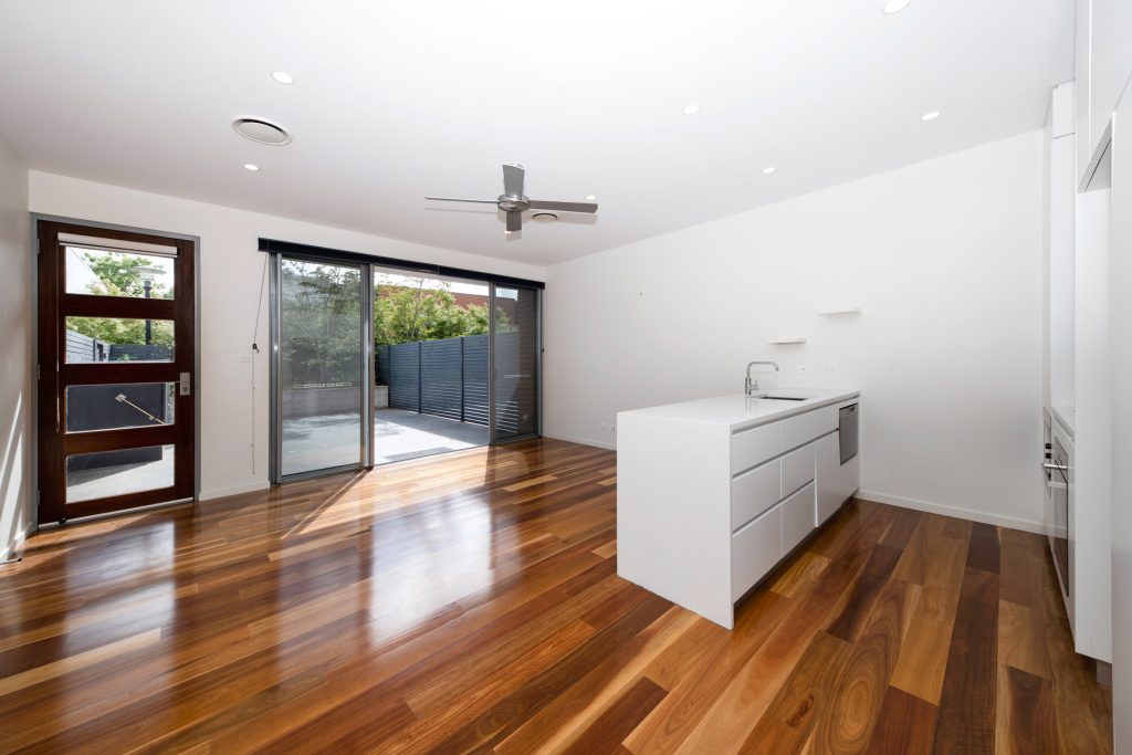 Open style combined living and dining, stylishly presented with wooden floors, high ceilings and full length sliding glass doors that open onto the courtyard.