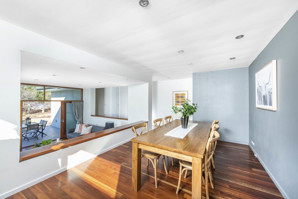 Attractive split level formal dining & sunken lounge – floor to ceiling windows & glass doors capture the colourful front garden vista perfectly