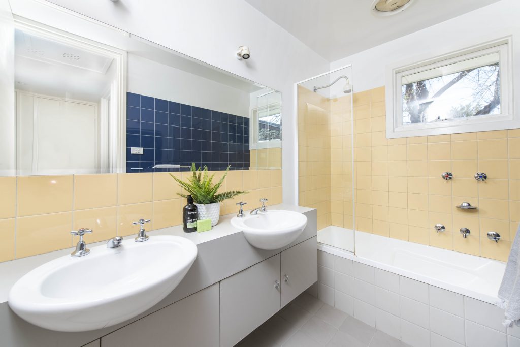 Updated bathroom with twin sinks, convenient shower/bath combination and vanity storage