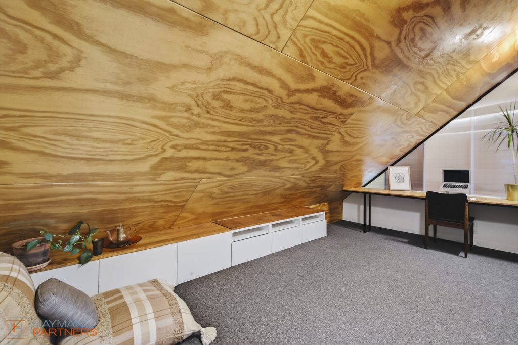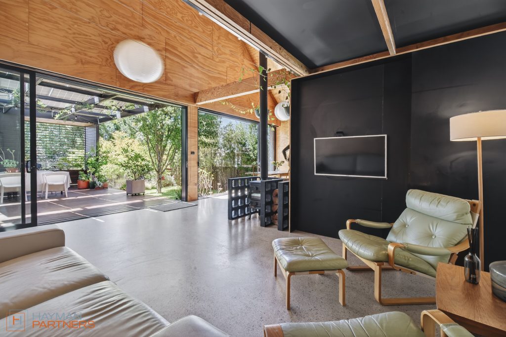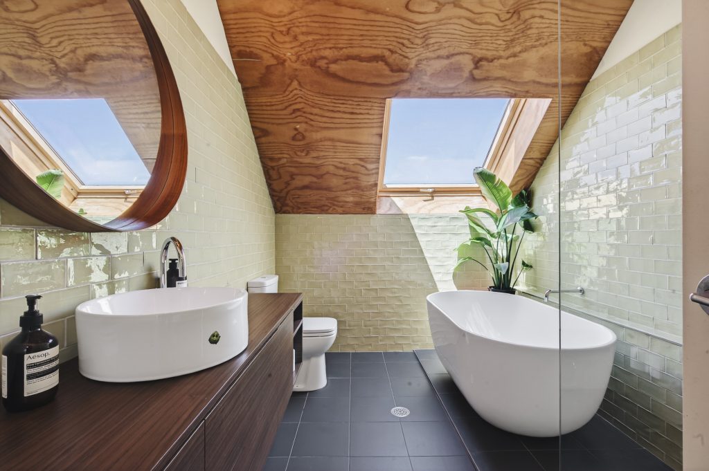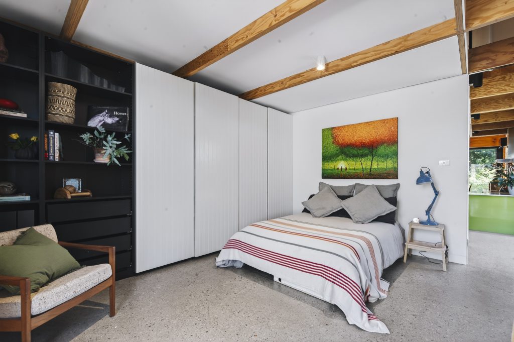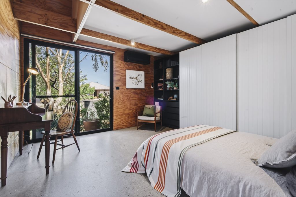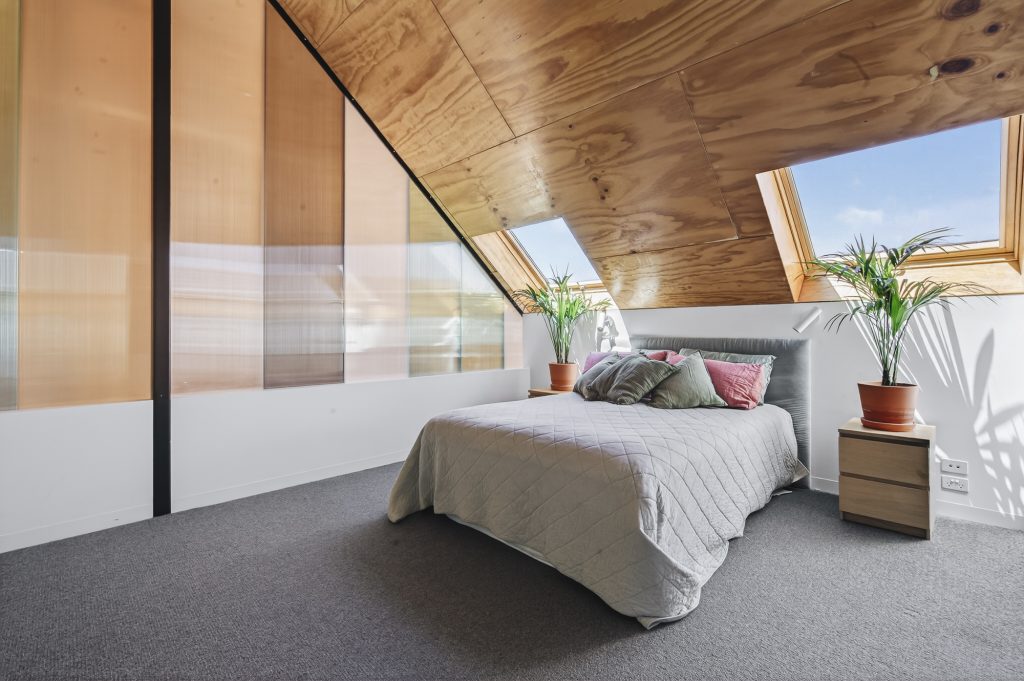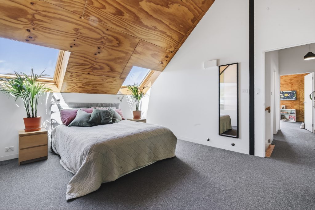 The home’s commitment to sustainability is evident throughout, with features including a 3.5kW photovoltaic system with panels positioned above the deck, an Evershine solar inverter, double glazing throughout, Velux roof windows, low-energy lighting, a Sanden heat pump hot water system and hydronic in-slab heating servicing five key areas of the home. A 5,000-litre rainwater tank is discreetly positioned beneath the deck, while split-system air conditioning units on the lower level provide additional year-round comfort.
