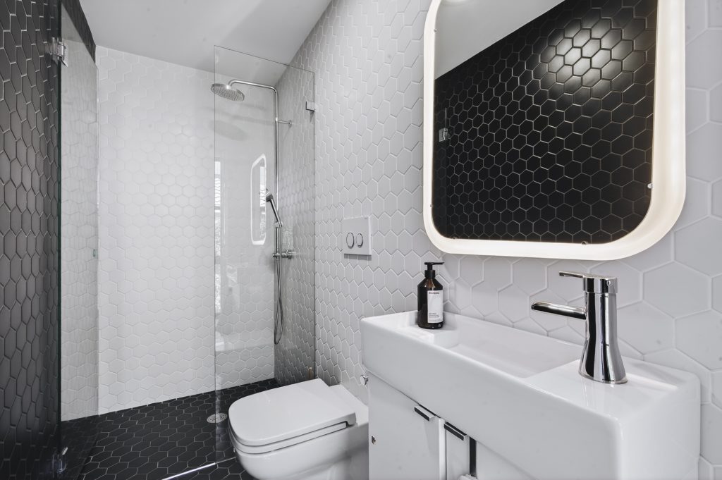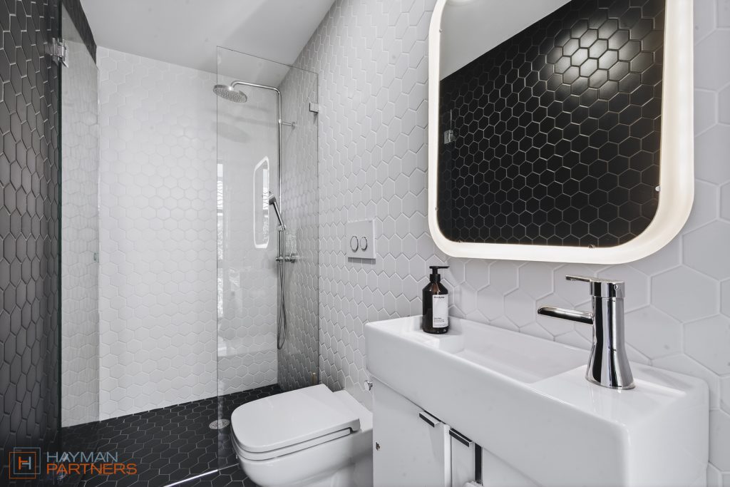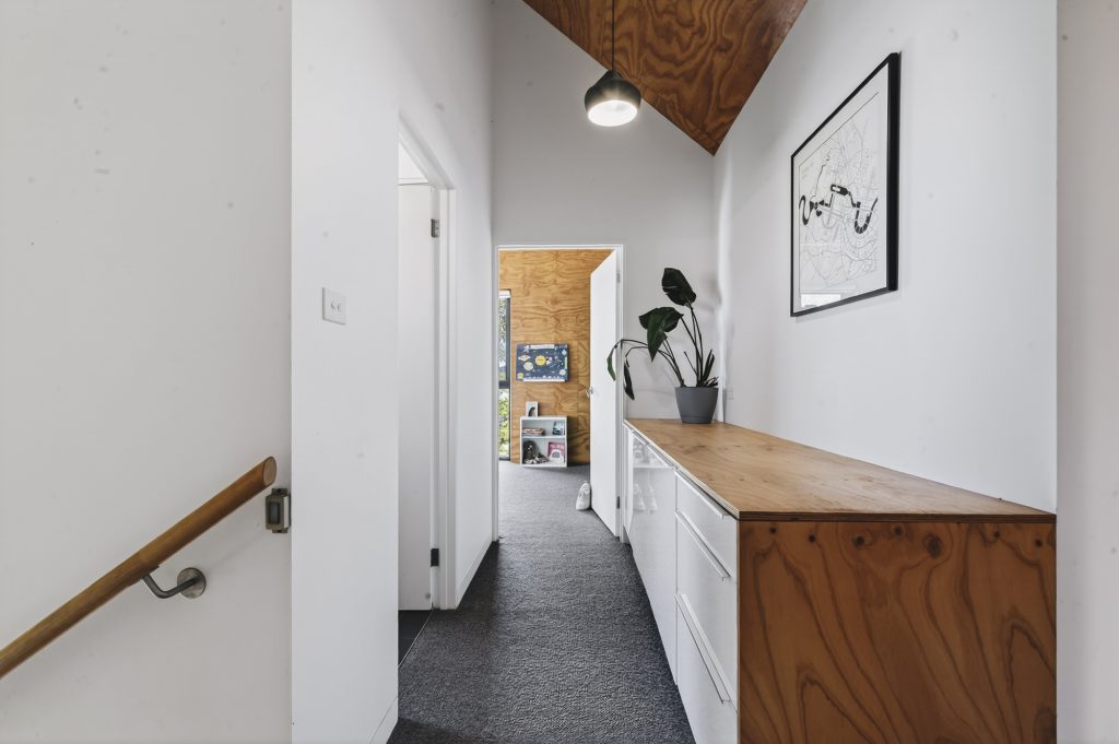 Accommodation is thoughtfully arranged across two levels. Upstairs, two well-proportioned bedrooms with built-in robes are positioned alongside the main bathroom. Complimenting the space are the Velux roof windows upstairs, which allow for natural light to flow in. Downstairs, the third bedroom is complemented by a second bathroom and enjoys its own external access, allowing it to function easily as a home office or guest suite.