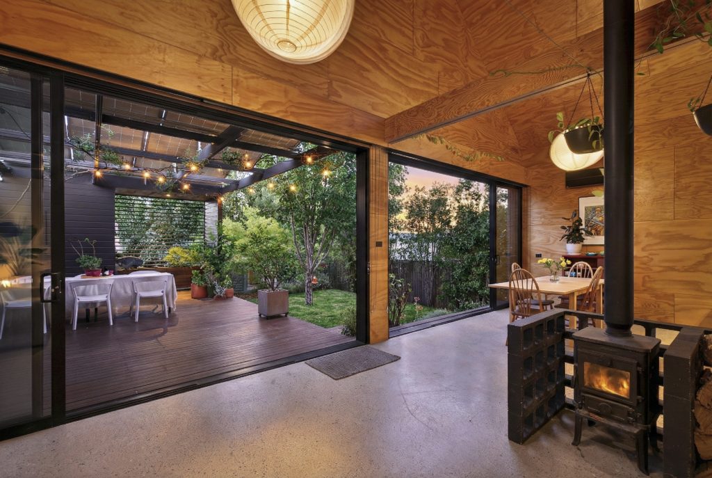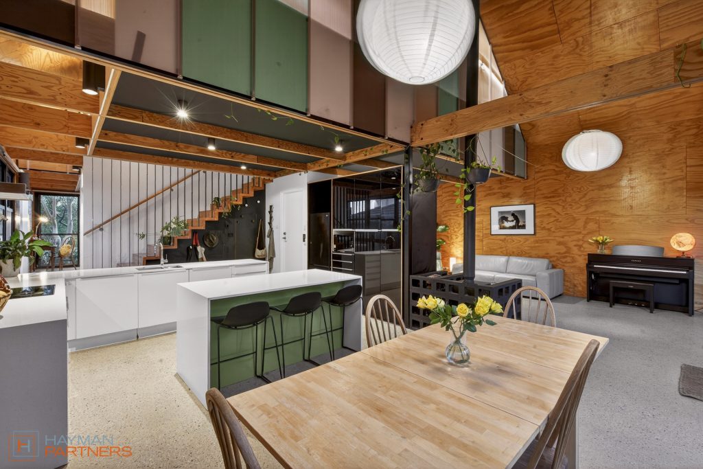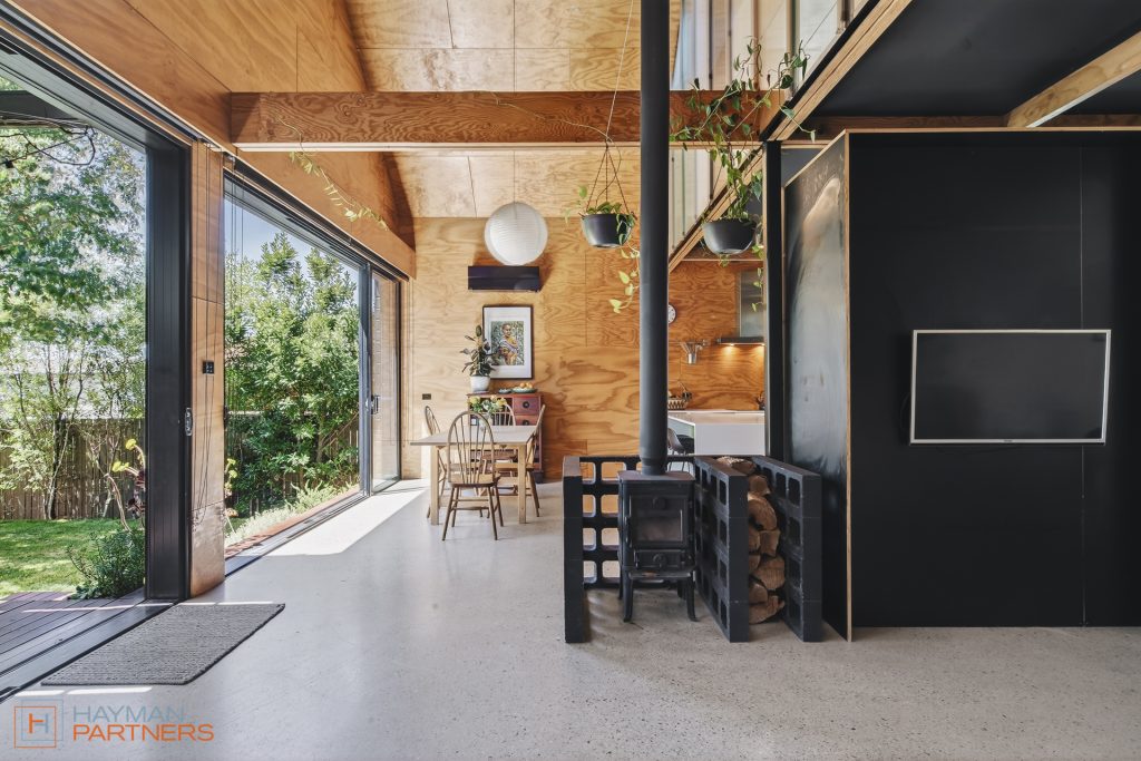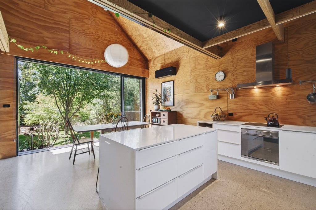 The heart of the home is the expansive open-plan living area, enhanced by high raked ceilings and a Morso slow combustion fireplace that provides exceptional warmth throughout the cooler months. Large north-facing stacking sliding doors allow natural light to pour in and create a seamless connection to the outdoor entertaining deck and rear gardens.