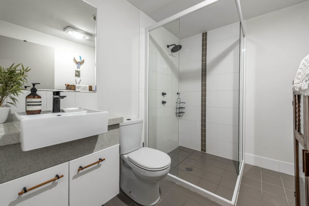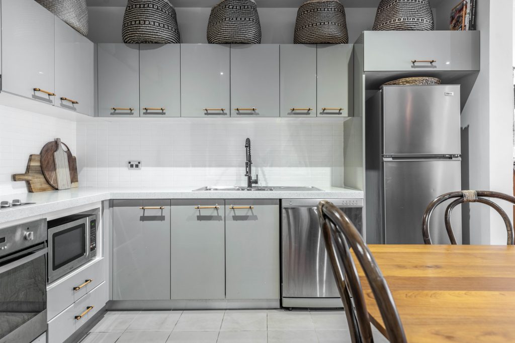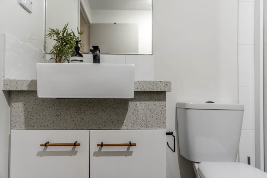 – Modern kitchen and bathroom with chrome tapware and stone benchtops