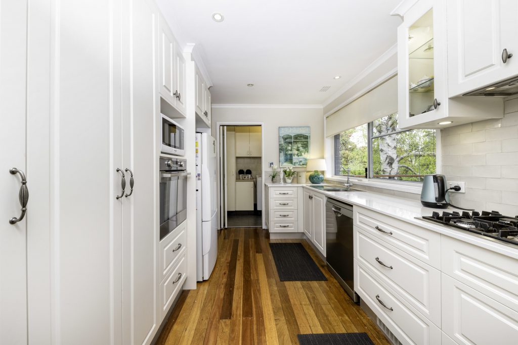 Renovated kitchen with updated appliances and bespoke serving hatch to rear deck