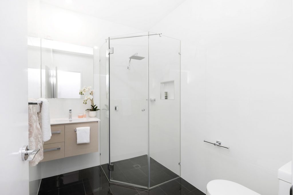 Floor to ceiling tiles in each bathroom plus wall-hung vanities