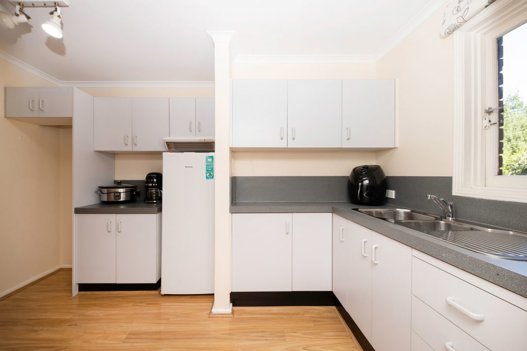 Modern kitchen with caesar stone benchtop, top quality appliances and skylight.