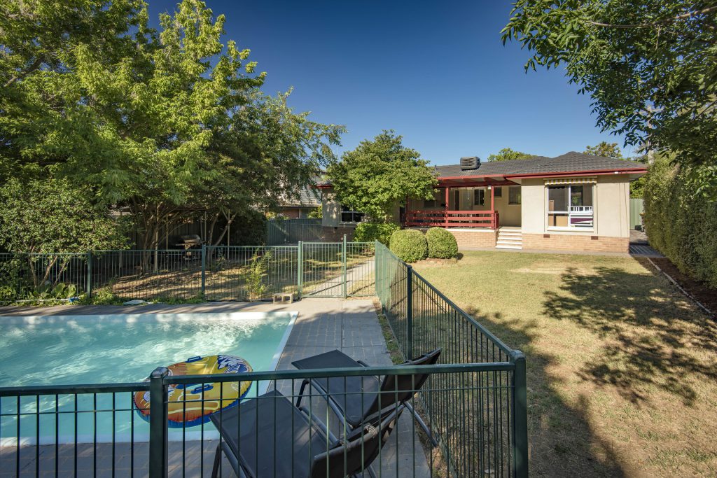 Nestled in a superb tree lined street within a sought after pocket of Farrer is this immaculate, fully renovated and extended single level home. Ideal for people who appreciate warmth, flow, entertaining and modern lifestyle living. This home boasts style with semi open plan living areas including a superb north – east facing formal lounge at the front of the home with adjacent dining area and a generous family area which connects superbly to both the modern kitchen and an elevated covered timber deck overlooking the rear gardens and pool. Accommodation includes three large bedrooms all with built-in robes, the master with modern ensuite and walk-in robe. Other features include ducted gas heating, ducted evaporative cooling, modern bathroom, quality appliances and large single semi-enclosed carport with auto door. Easy care landscaped gardens surround the in-ground pool. Tastefully decorated throughout with modern fittings, fixtures and colours. Stroll to local schools, shops and parkland and a short drive to Woden and Canberra city centres. A unique offering.