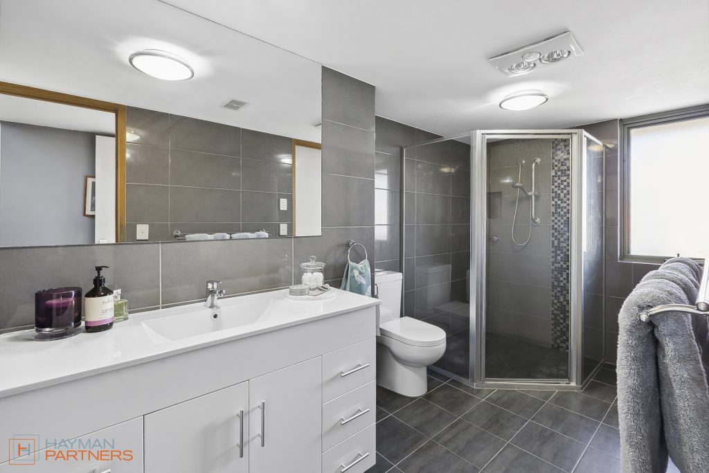 The bathroom has been recently renovated to create a contemporary space, with inclusions such as large vanity, floor-to-ceiling tiles, large corner shower, and extra-long mirror. The bathroom offers an additional doorway that enters the bedroom.