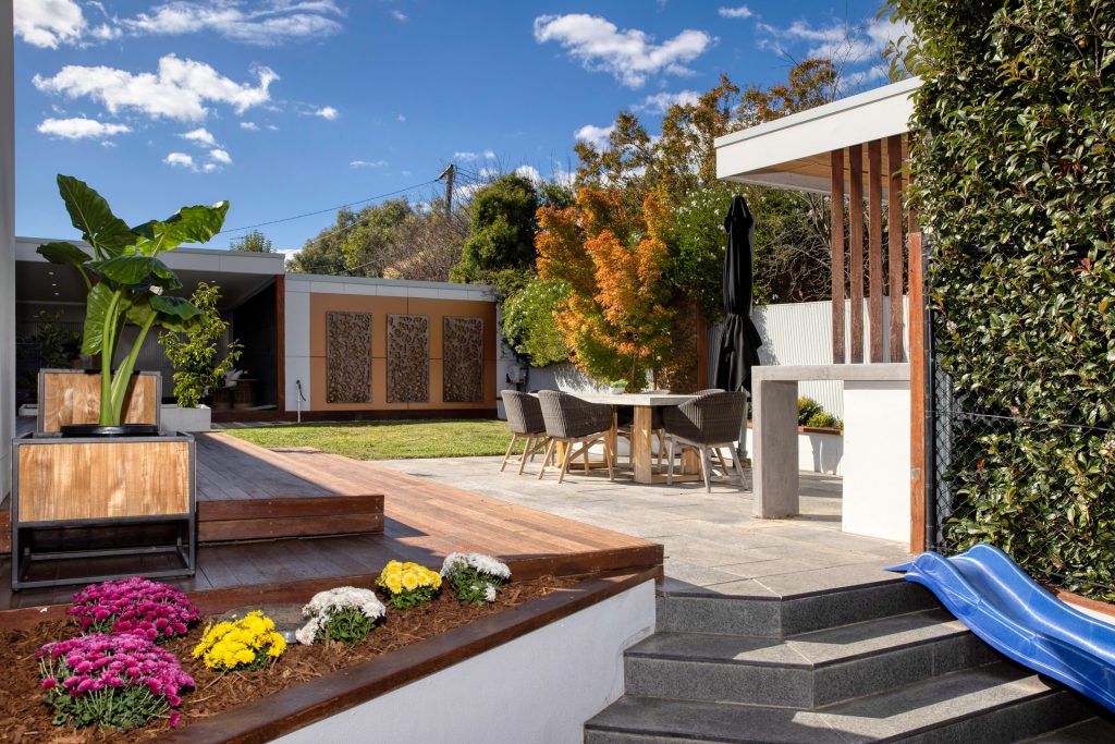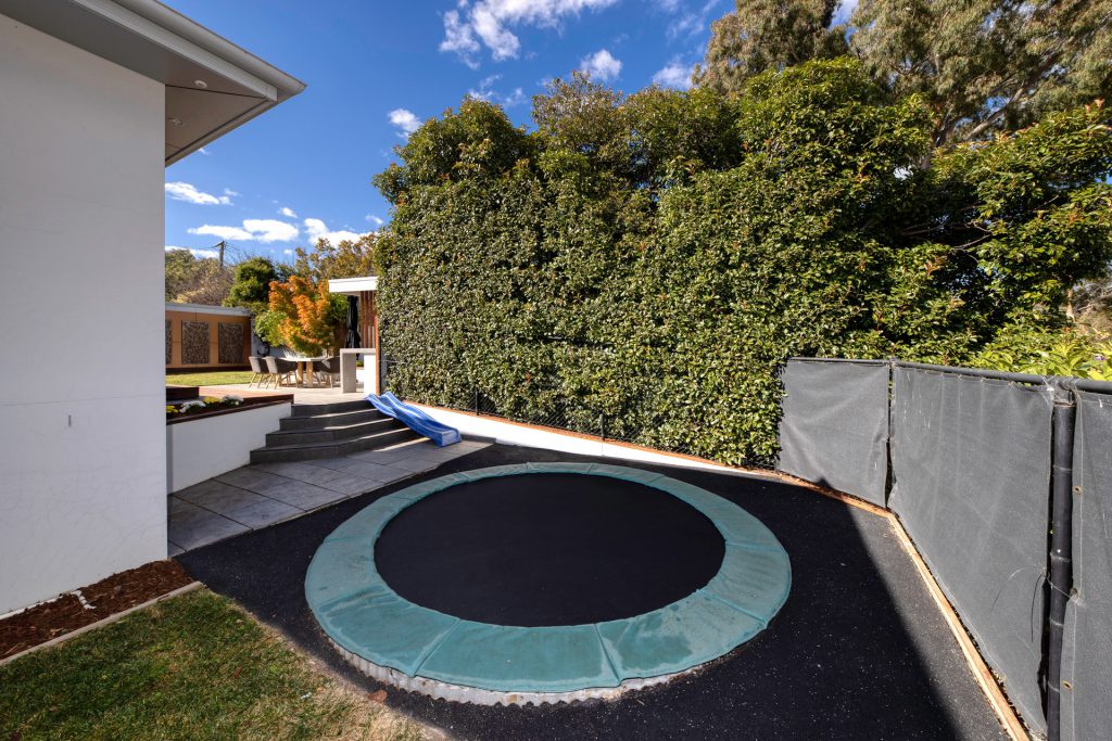 Fully landscaped gardens with integrated watering system, paved entertaining area and in-ground trampoline perfect for the kids
