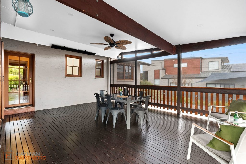 – Merbau decked outdoor entertaining area (38m² approx.) with downlights and ceiling fan, alfresco blinds and radiant panel heater