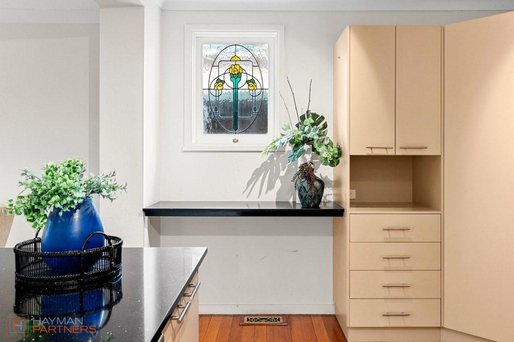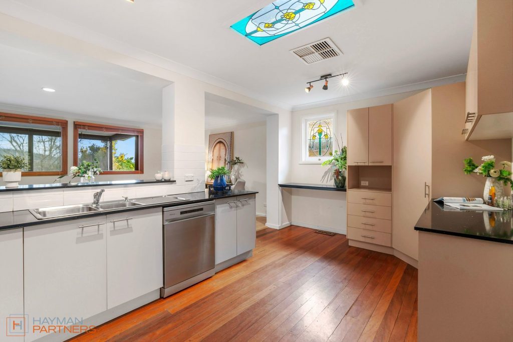 – Centrally located open plan kitchen with stone benchtops, stained glass skylight and window, neutral finishes, Bosch gas stovetop, pyrolytic oven, double drawer dishwasher and ample storage