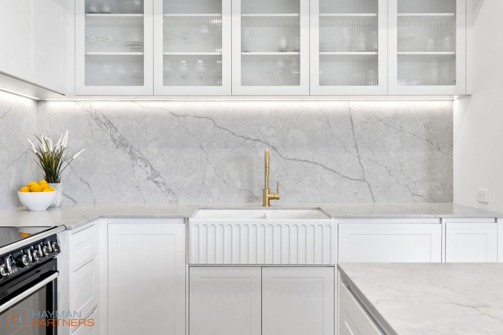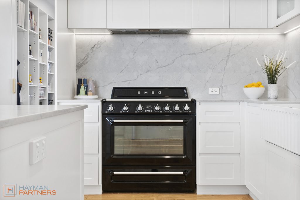 – Kitchen has Talostone benchtops and backsplash, a Smeg 90cm Victoria Induction Cooker, Shweigen rangehood, farmhouse sink