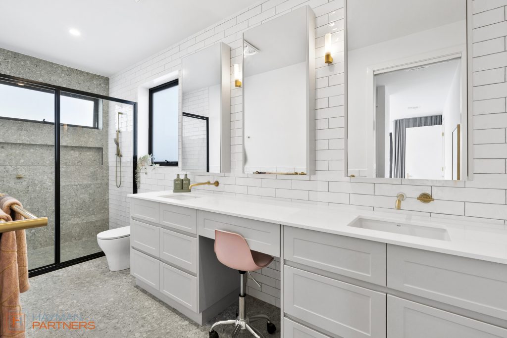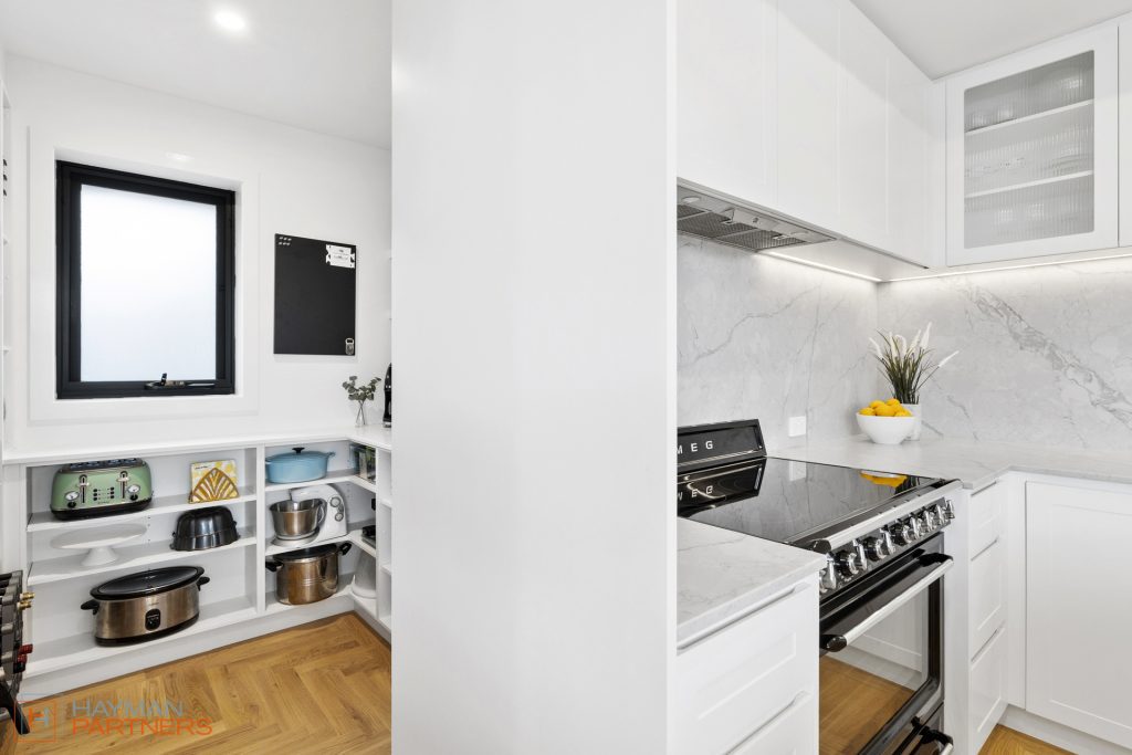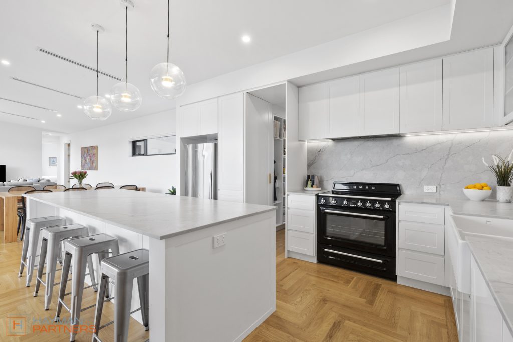 With beautiful modern lines, finishes and textures – stunning varied height ceilings complement the comprehensive selection of top-quality materials that have been used throughout. Offering large open plan living areas with large, double-glazed windows with enough segregation for families to spread out when needed. The ultra-modern kitchen is ideal for any chef with a feature walk in butler’s pantry, large island bench and Smeg 90cm induction cooker.