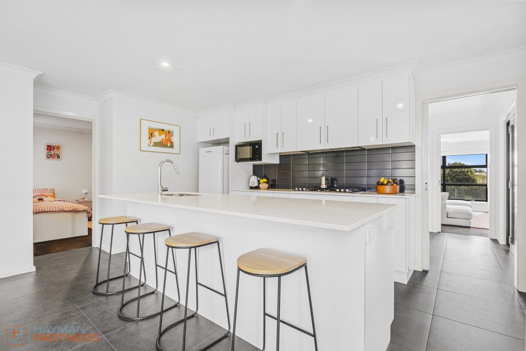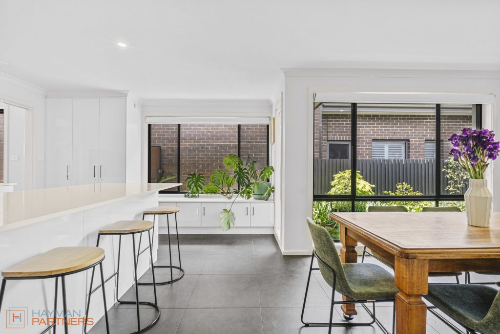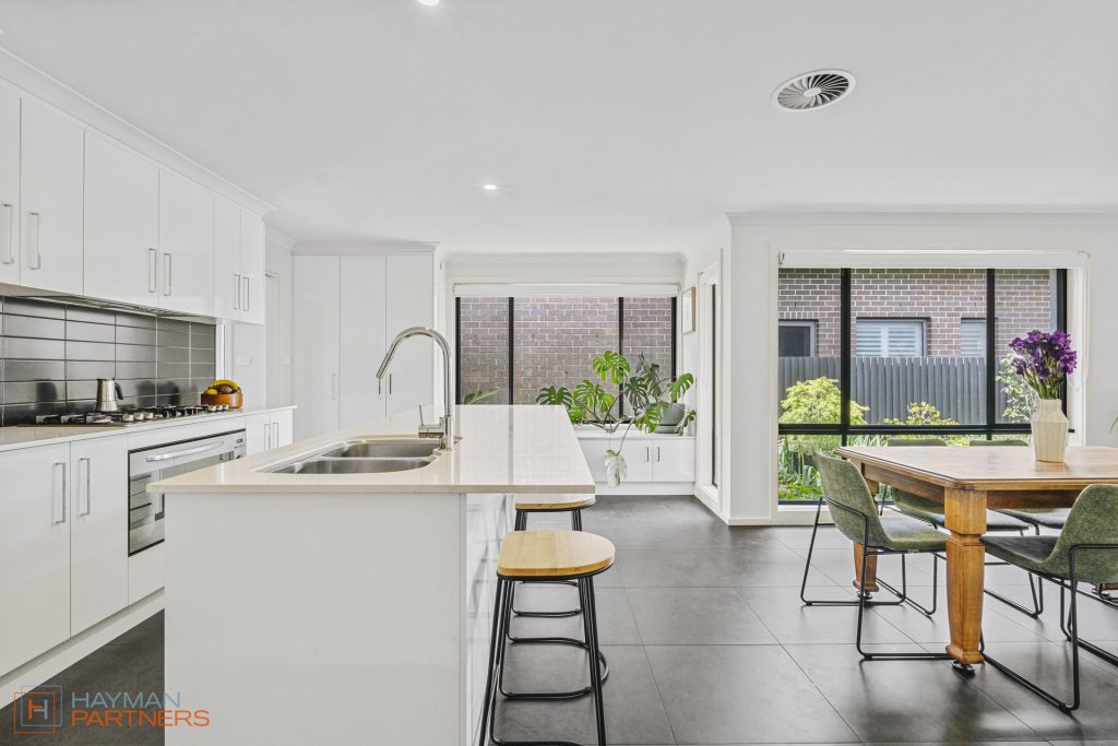 This single-level home features an open plan design, with the living, dining and kitchen all combining seamlessly together. Complementing these spaces is the abundance of natural light thanks to the north-facing position in the front living room. The kitchen boasts an abundance of storage throughout, plus the large stone benchtop in the center. Flowing from the kitchen is the open plan dining area and secondary living space. Enhancing the entire space is the level of natural greenery visible through the large windows, adding a level of tranquility to the home.