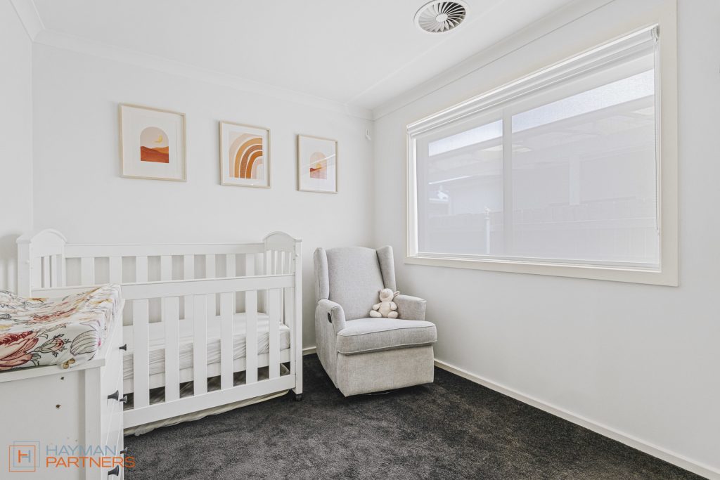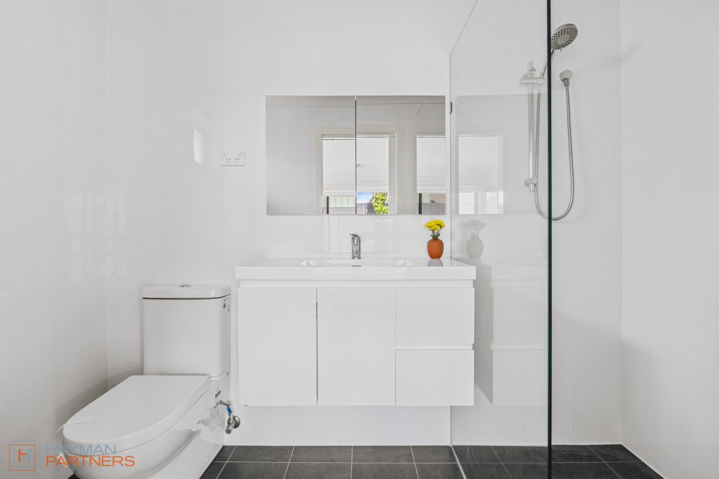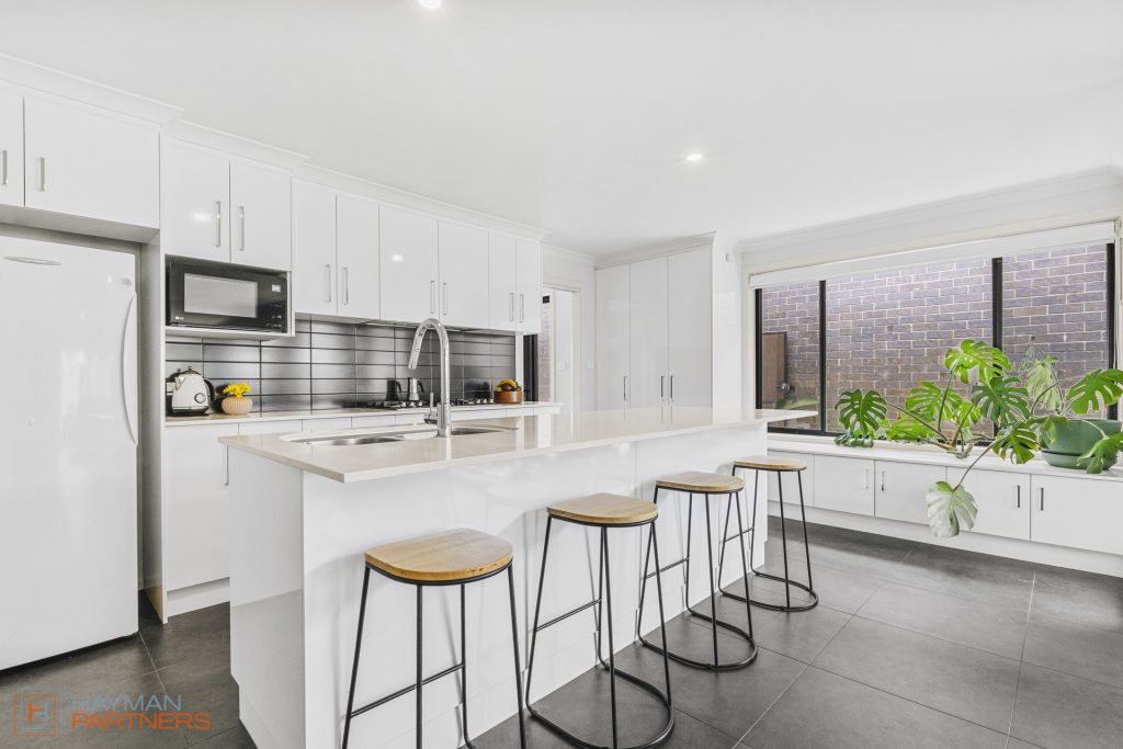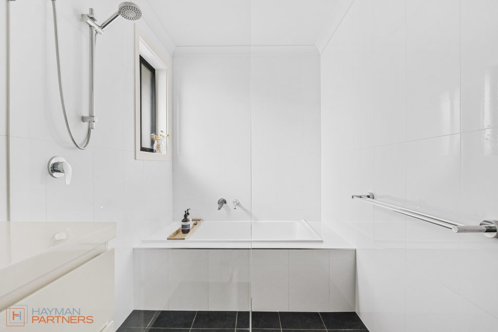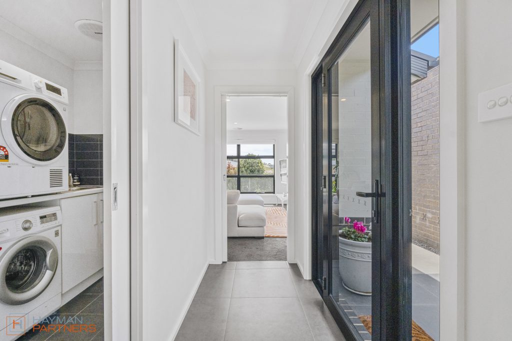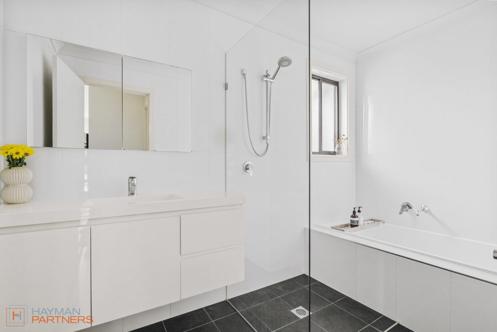 Accommodation includes three spacious bedrooms. The master suite offers a generous layout, complete with a built-in robe and a stylish ensuite. The remaining two bedrooms feature built-in robes and share a well-appointed main bathroom, complete with a floating vanity, separate shower, and bathtub. Behind the kitchen you will find the separate laundry room with ample storage.